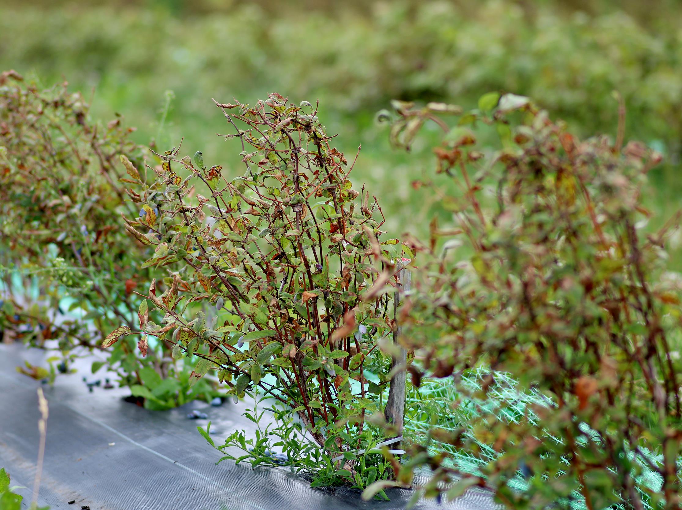 Cette photo prise à la mi-juillet montre la faible reprise des plants de camérisiers à la suite d'un gel printanier. Les plants sont chétifs et le feuillage est brunit et peu abondant.