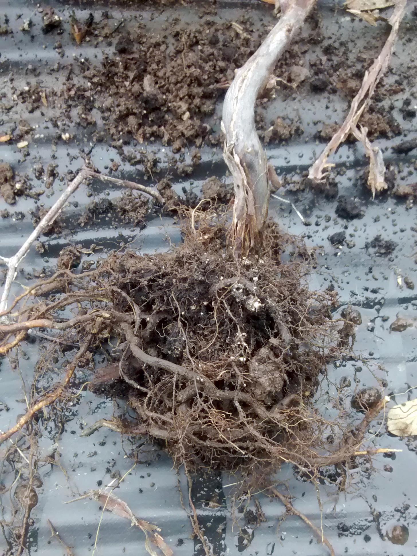 Racines de camérisier brûluées par l'engrais granulaire mal distribué.