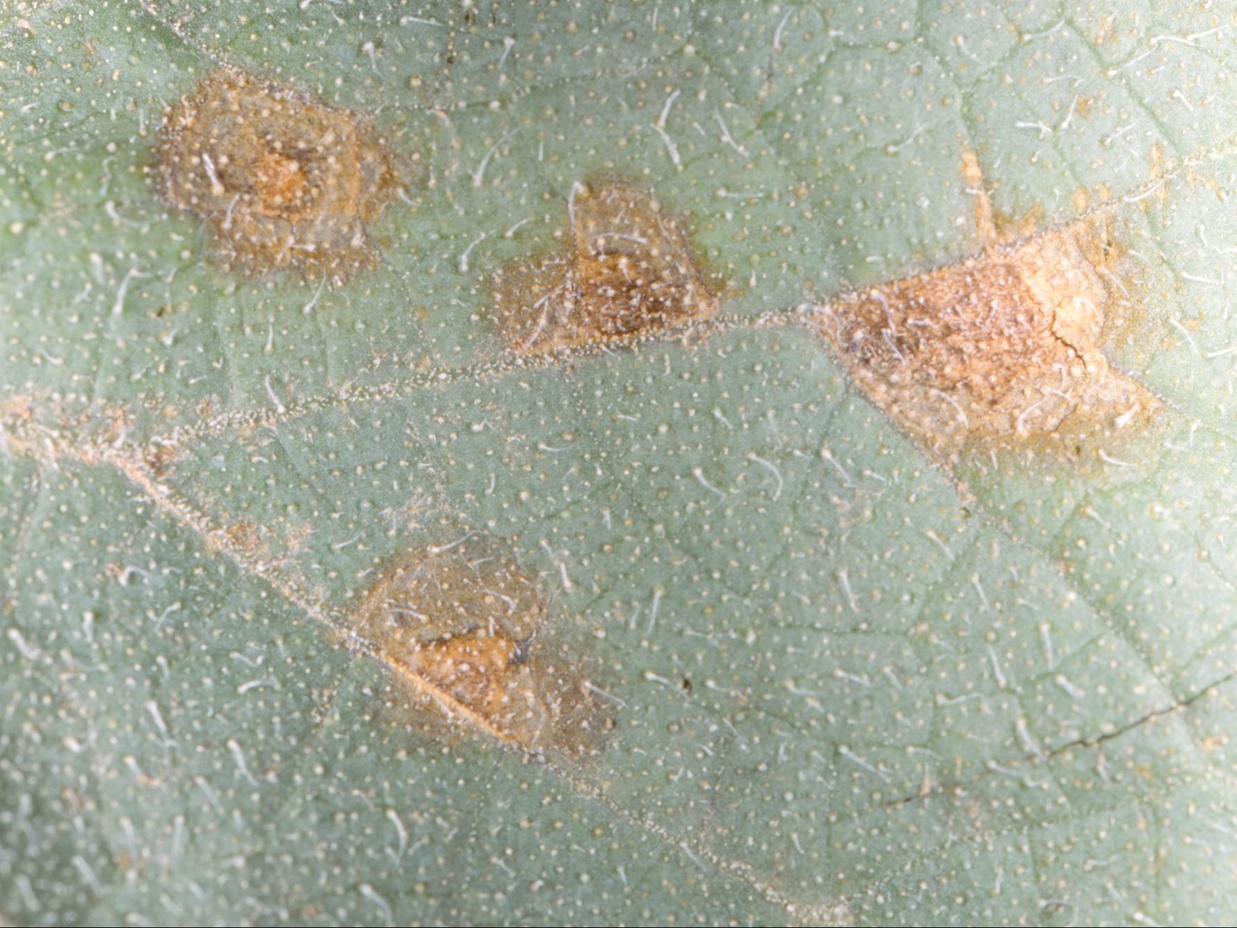 Une vue rapprochée de la face supérieure d’une feuille de concombre de champ montre la présence de taches beiges à brunes, circulaires à légèrement angulaires. Leur dimension varie entre 3 et 4 mm. Il peut y avoir entre 7 et 10 taches par feuille. Les tests de laboratoire ont révélé la présence du champignon Alternaria alternata, responsable de la tache alternarienne des feuilles.