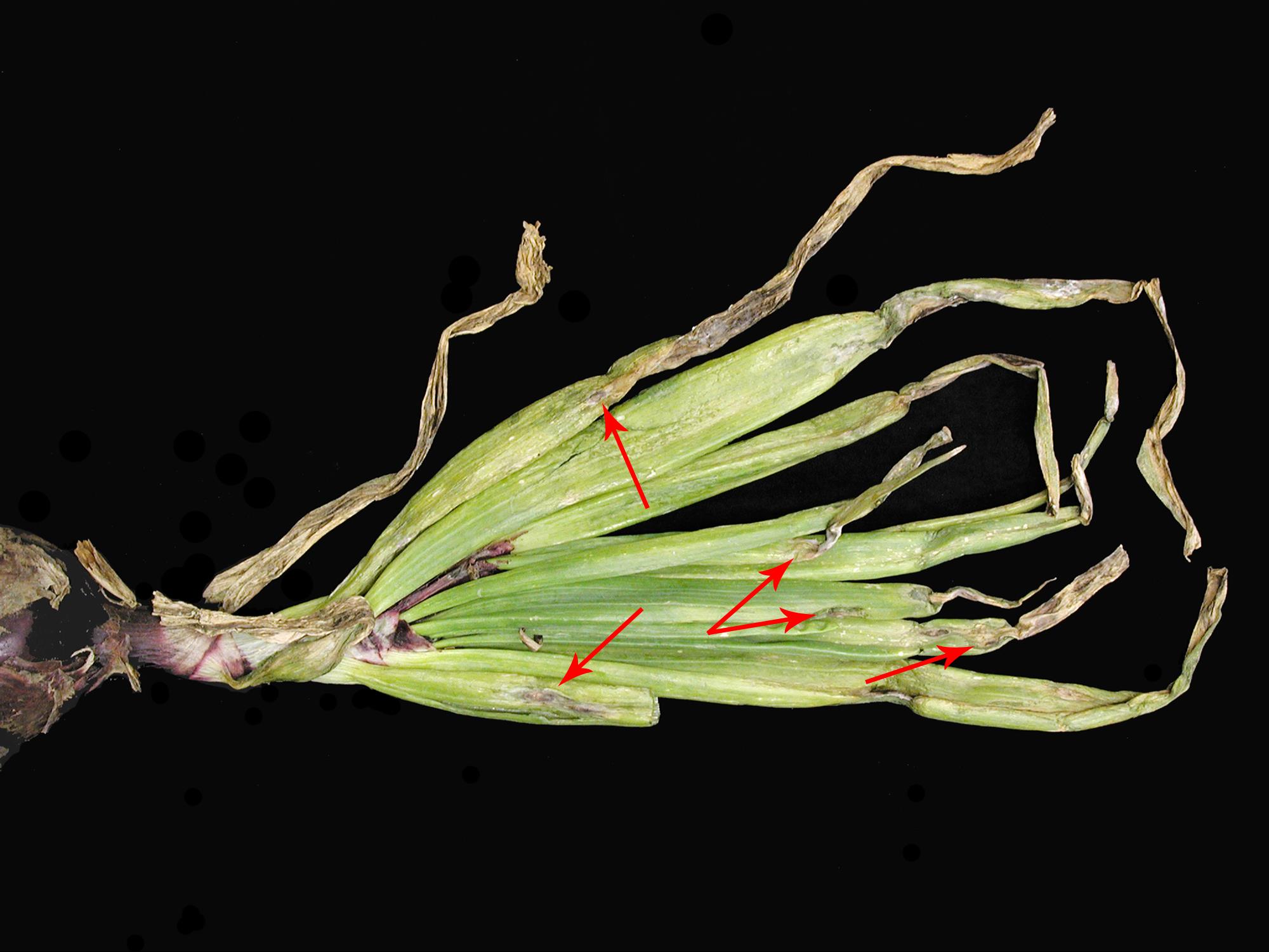 Sur un plant d'oignon espagnol (cv 'Red Fortress') provenant d’un champ, toutes les feuilles présentent des brûlures à leur extrémité. Immédiatement sous ces brûlures, il y a de grandes taches pourpres (voir flèches) mesurant plusieurs cm de diamètre. Les tests de laboratoire ont révélé la présence de mycélium et de conidies du champignon Alternaria porri, responsable de la tache pourpre chez l’oignon. Notez que le champignon Stemphylium sp. a été observé sur les feuilles. Il envahit souvent les dommages causés par A. porri.