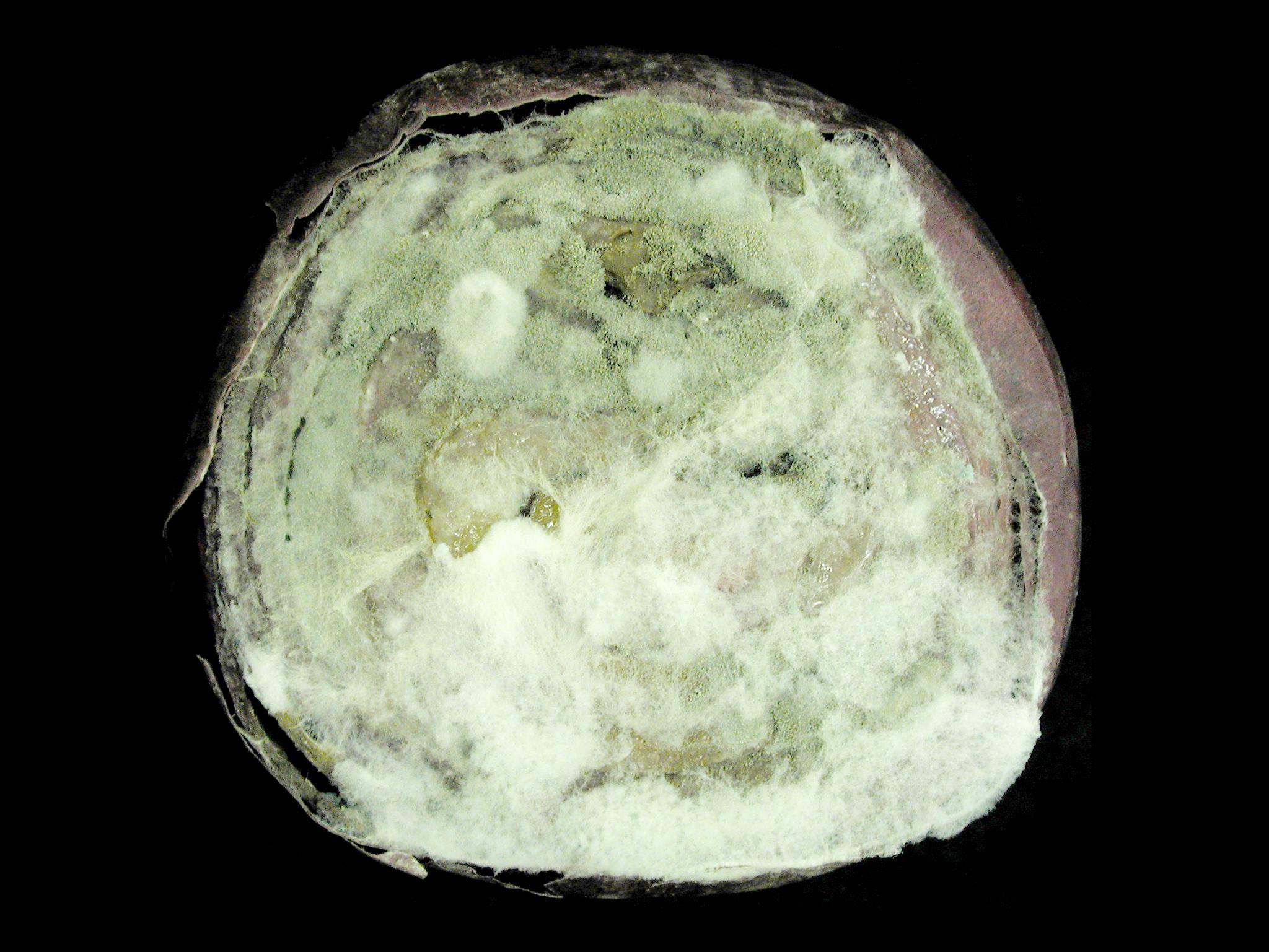 L’intérieur d’un bulbe d’oignon espagnol (cv 'Red Fortress') provenant d’un entrepôt est complètement recouvert d’un mycélium et de conidies grisâtres. La moisissure s’est développée à la suite d’une pourriture touchant l’ensemble des tuniques. Les tests de laboratoire ont révélé la présence du champignon Botrytis sp., responsable de la pourriture du col chez les Allium.