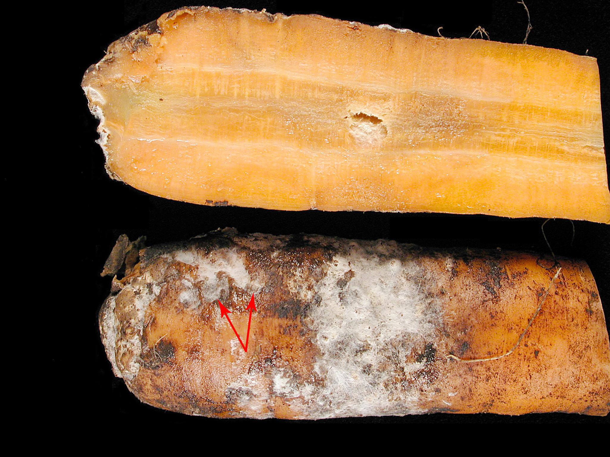 En entrepôt, l’épiderme de la racine est pourri et couvert d’un mycélium blanchâtre. Début de formation de petits sclérotes beiges et un peu fermes (voir flèches). Les tissus internes sont bruns, humides et caoutchouteux. Les tests de laboratoire ont révélé la présence du champignon Botrytis cinerea, responsable de la moisissure grise chez la carotte.