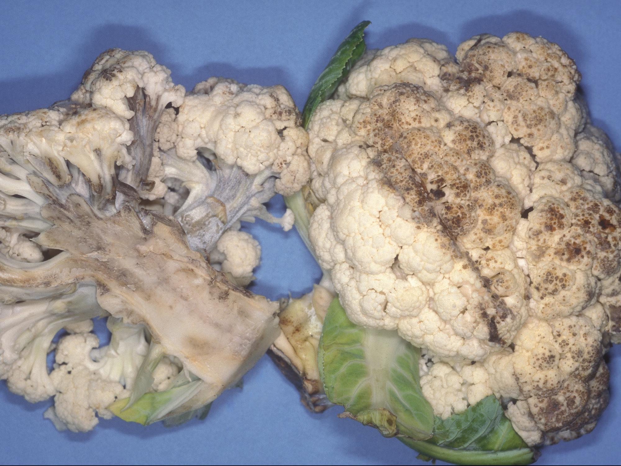 Le dessus d’un chou-fleur (cv 'Chieftain') est ponctué de taches brunâtres à grisâtres. En coupant les bouquets floraux, on constate la présence d’un brunissement à noircissement des pédicelles et de la tige principale. Les observations microscopiques ont révélé la présence de l'agent pathogène Peronospora parasitica, responsable du mildiou chez les crucifères. Ces symptômes ont été observés au champ lors de la récolte en septembre. Le conseiller agricole mentionne que plus de 30 % des inflorescences sont affectées. La variété Chieftain serait plus sensible aux maladies et à la carence en bore (B).