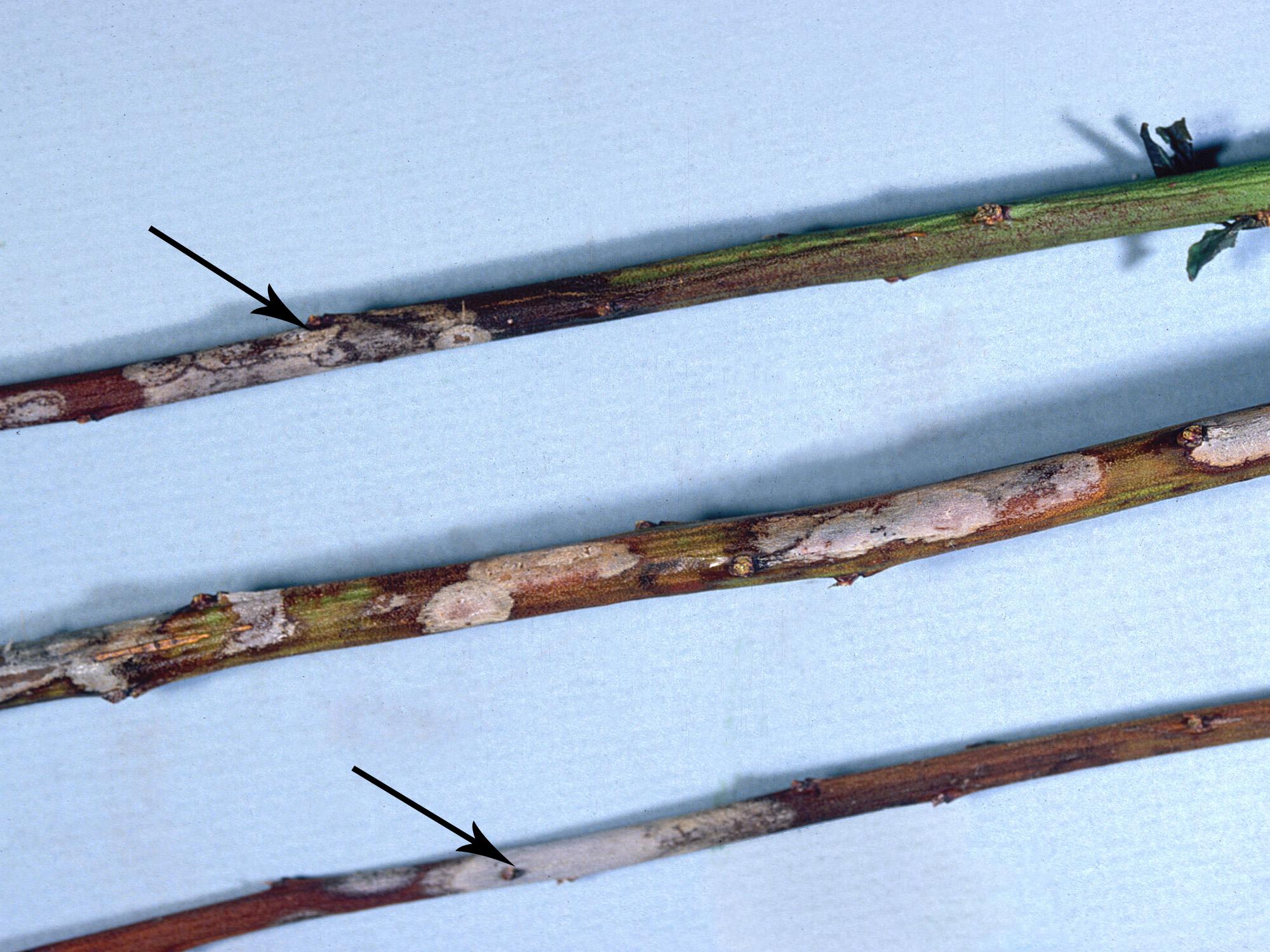 Sur de jeunes tiges de bleuet en corymbe, présence de taches grisâtres encerclant les cicatrices foliaires (voir flèches). Les tiges se dessèchent et l’épiderme devient brun. Les tests de laboratoire ont révélé la présence du champignon Fusicoccum putrefaciens, responsable du chancre à Fusicoccum chez le bleuet en corymbe.