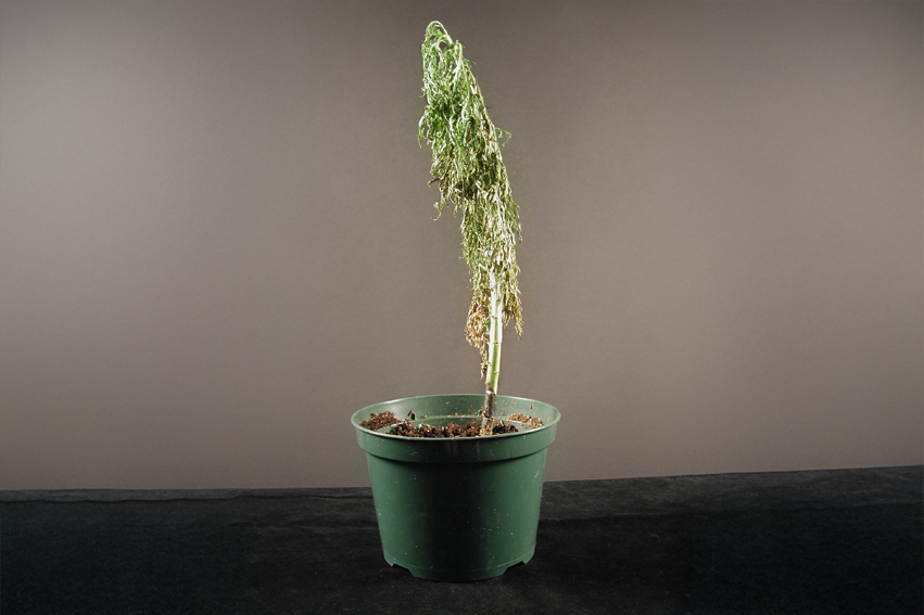 Un plant d’argyranthemum cultivé en serre est complètement flétri. Le collet montre un chancre noir (voir cercle) progressant vers la partie basale de la tige. Le chancre pénétrait légèrement dans les tissus. Les racines sont pourries, brunes et se détachent facilement du plant (non visible ici). Les tests de laboratoire ont révélé la présence des champignons Phytophthora cactorum et Pythium sp. dans le collet. Ces deux champignons peuvent causer des chancres au collet.