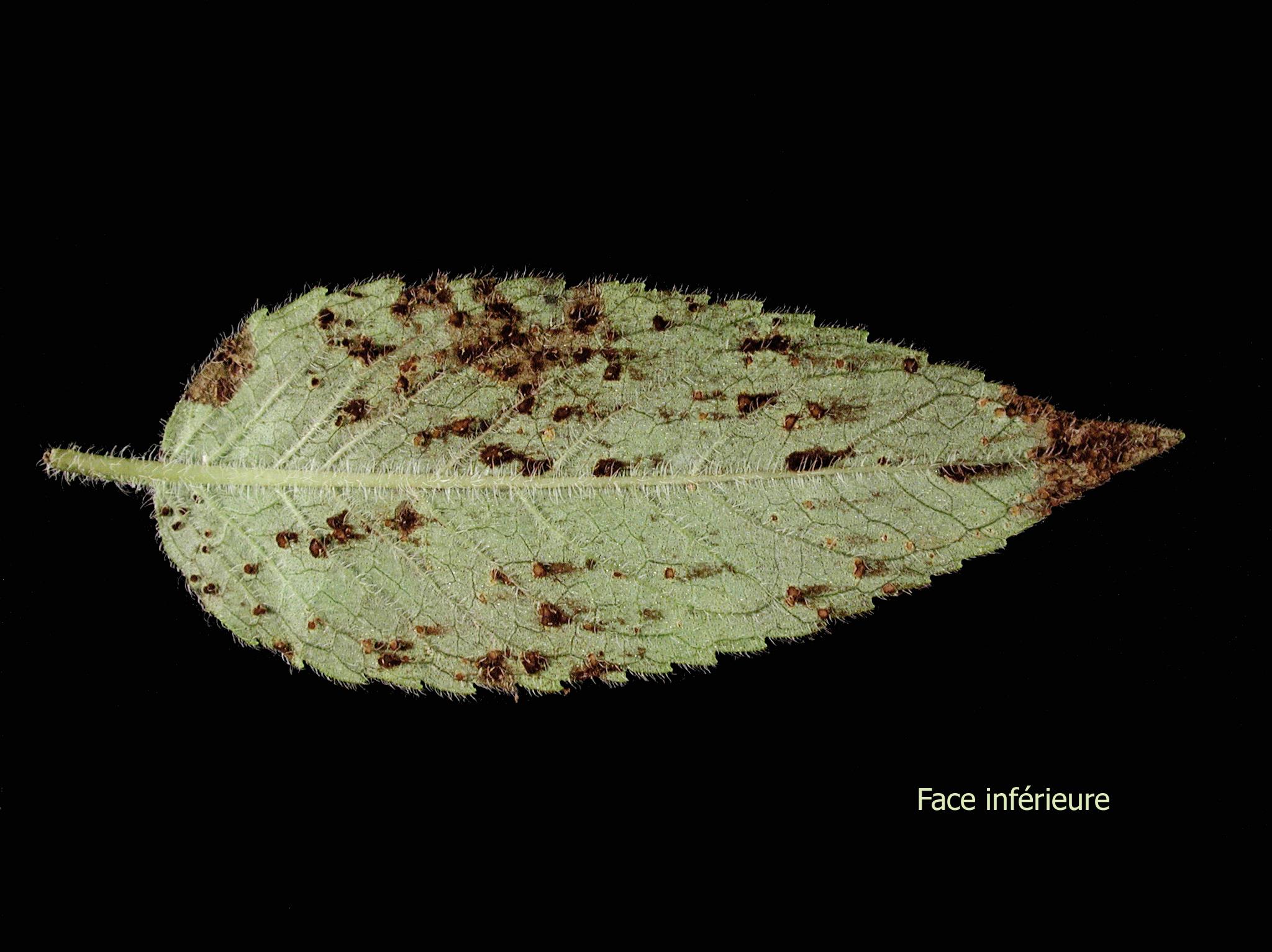 À la face inférieure d’une feuille de monarde, présence de pustules surélevées brunes. Chaque pustule se trouve vis-à-vis une tache à la face supérieure. Tous les niveaux de feuille sont affectés. Les observations microscopiques ont révélé la présence d’urédospores et de téliospores du champignon Puccinia sp., responsable d’une rouille. Chez la monarde, quelques espèces de Puccinia sont rapportées. Le conseiller agricole mentionne que tous les plants de la pépinière sont affectés.