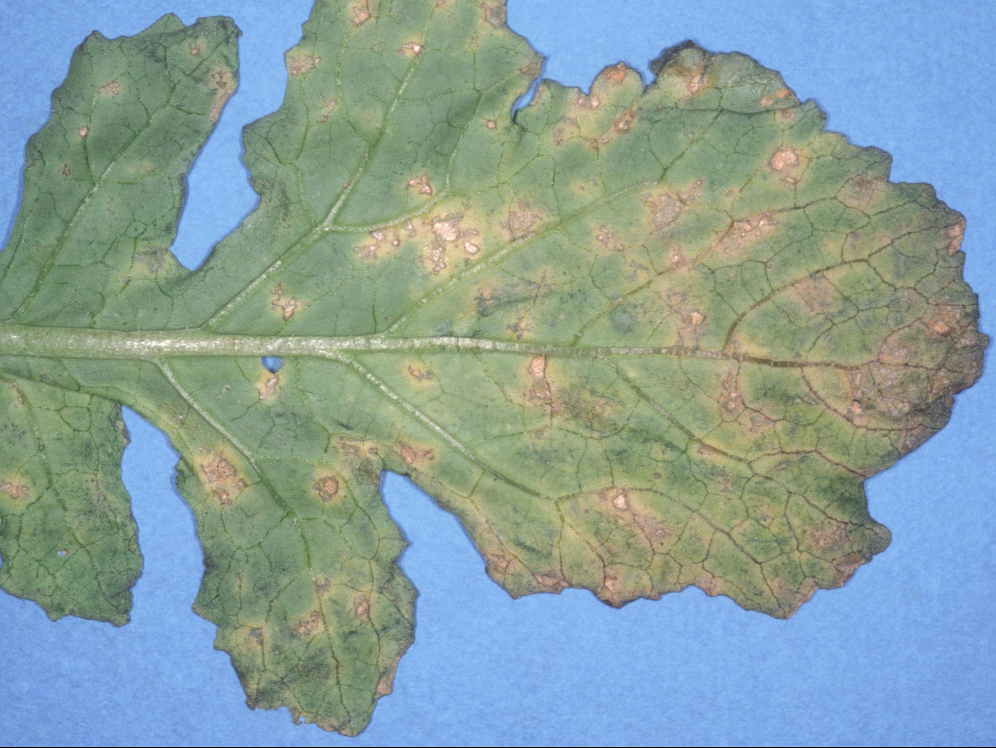À la face inférieure d’une feuille de navet provenant d’un champ, présence de nombreuses taches beiges avec une marge foncée, irrégulières à angulaires, parfois délimitées par les nervures et entourées d’un halo jaune. Les observations microscopiques ont révélé la présence de l'agent pathogène Hyaloperonospora parasitica, responsable du mildiou chez les crucifères.