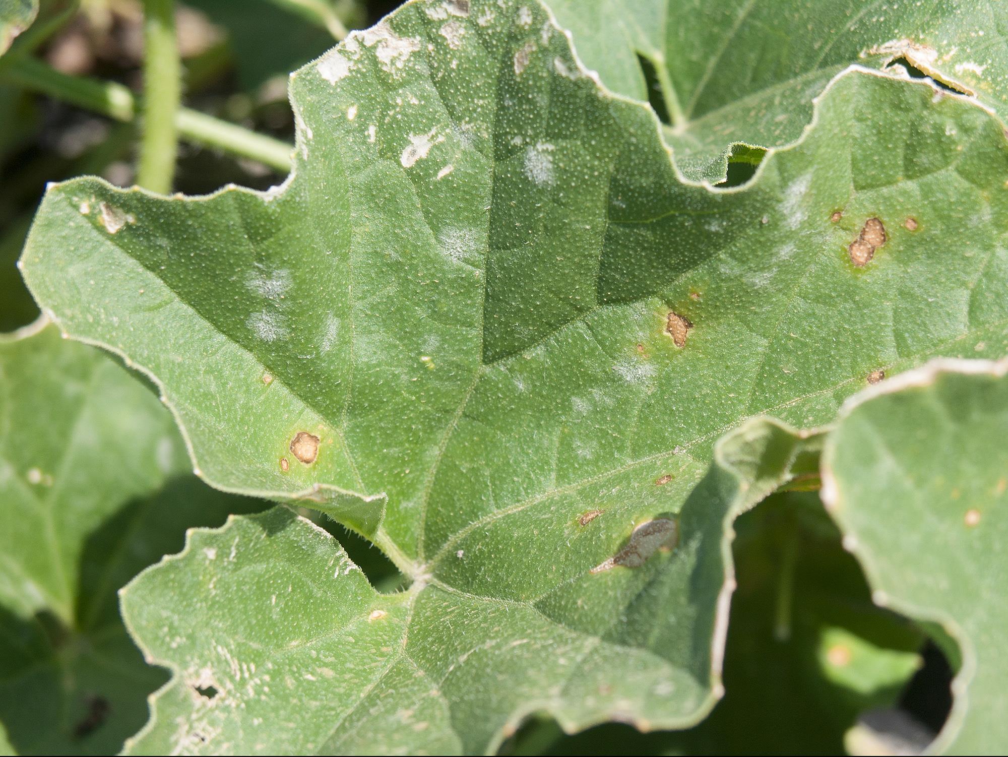 À la face supérieure d'une feuille de melons brodés (cantaloup), présence d'un mycélium blanc, dense et poudreux qui apparaît sous la forme de taches plutôt rondes et blanchâtres. Les observations microscopiques ont révélé la présence de conidiophores portant de longues chaînes de conidies caractéristiques d’un champignon causant la maladie du blanc (oïdium). Il s’agit probablement de Sphaerotheca fuliginea.