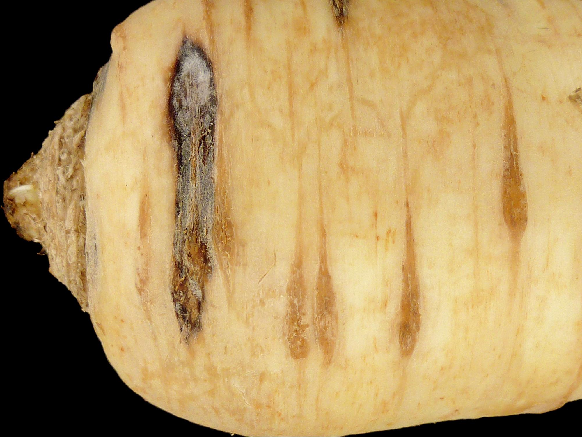 Une vue rapprochée d'un panais provenant d’un entrepôt montre une lésion brune à noire, de forme allongée, sur une lenticelle. Cette lésion est située dans la partie supérieure de la racine. Les tests de laboratoire ont révélé la présence du champignon Itersonilia perplexans, responsable du chancre à Itersonilia chez le panais.