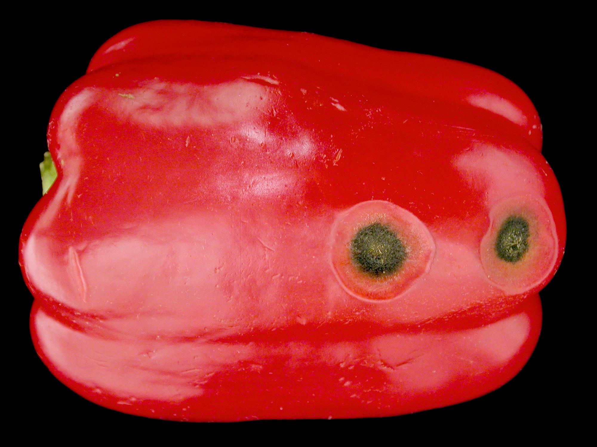Un poivron montre des taches déprimées avec des fructifications noires au centre. Les tests de laboratoire ont révélé la présence du champignon Colletotrichum sp., responsable de l’anthracnose chez le poivron.