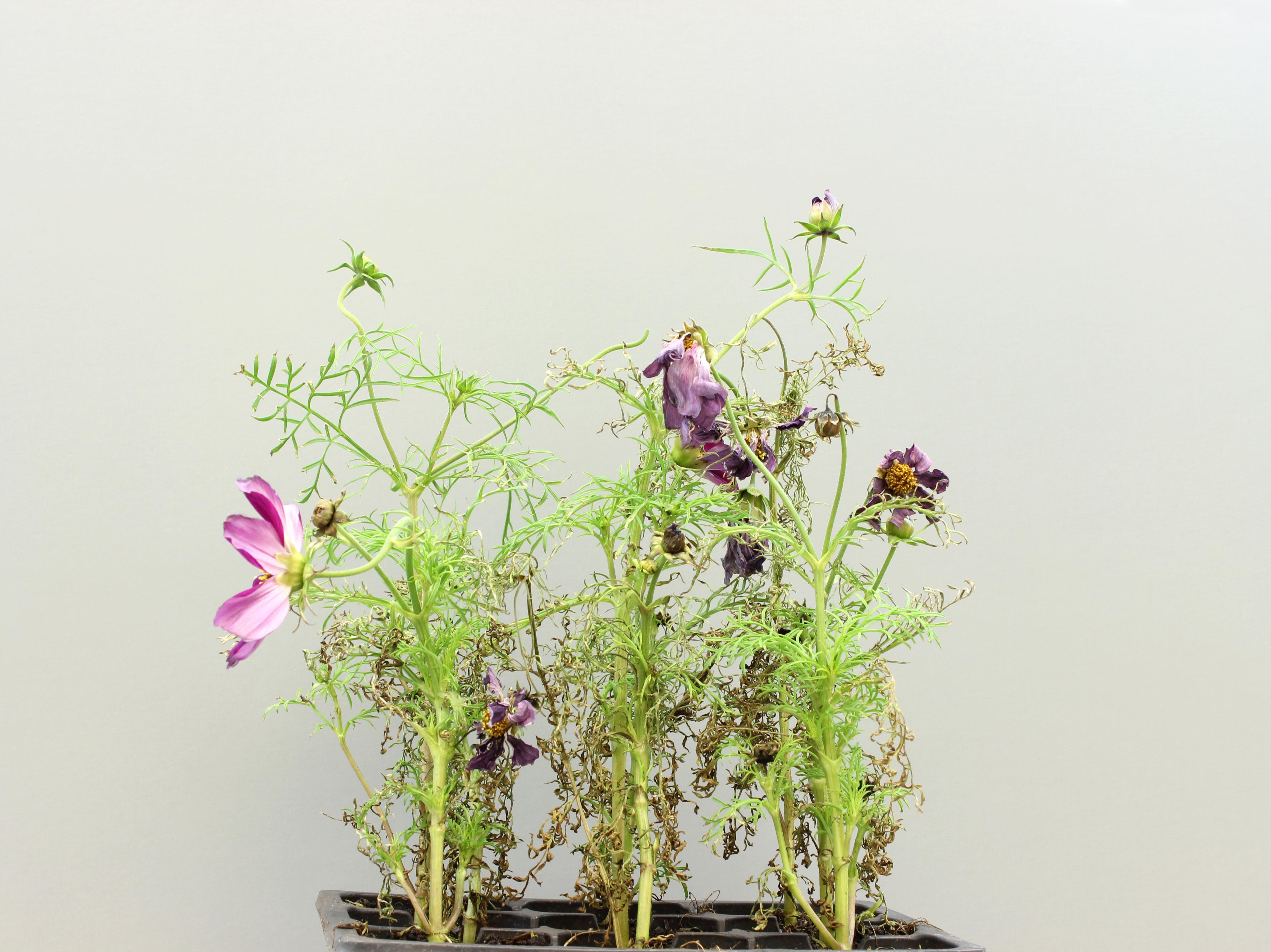 Le conseiller agricole mentionne que les symptômes sont apparus rapidement, en moins d’une semaine. Environ 10 % des plants sont affectés et les symptômes semblent se propager uniquement dans les cosmos malgré la présence de différentes plantes annuelles avoisinantes.