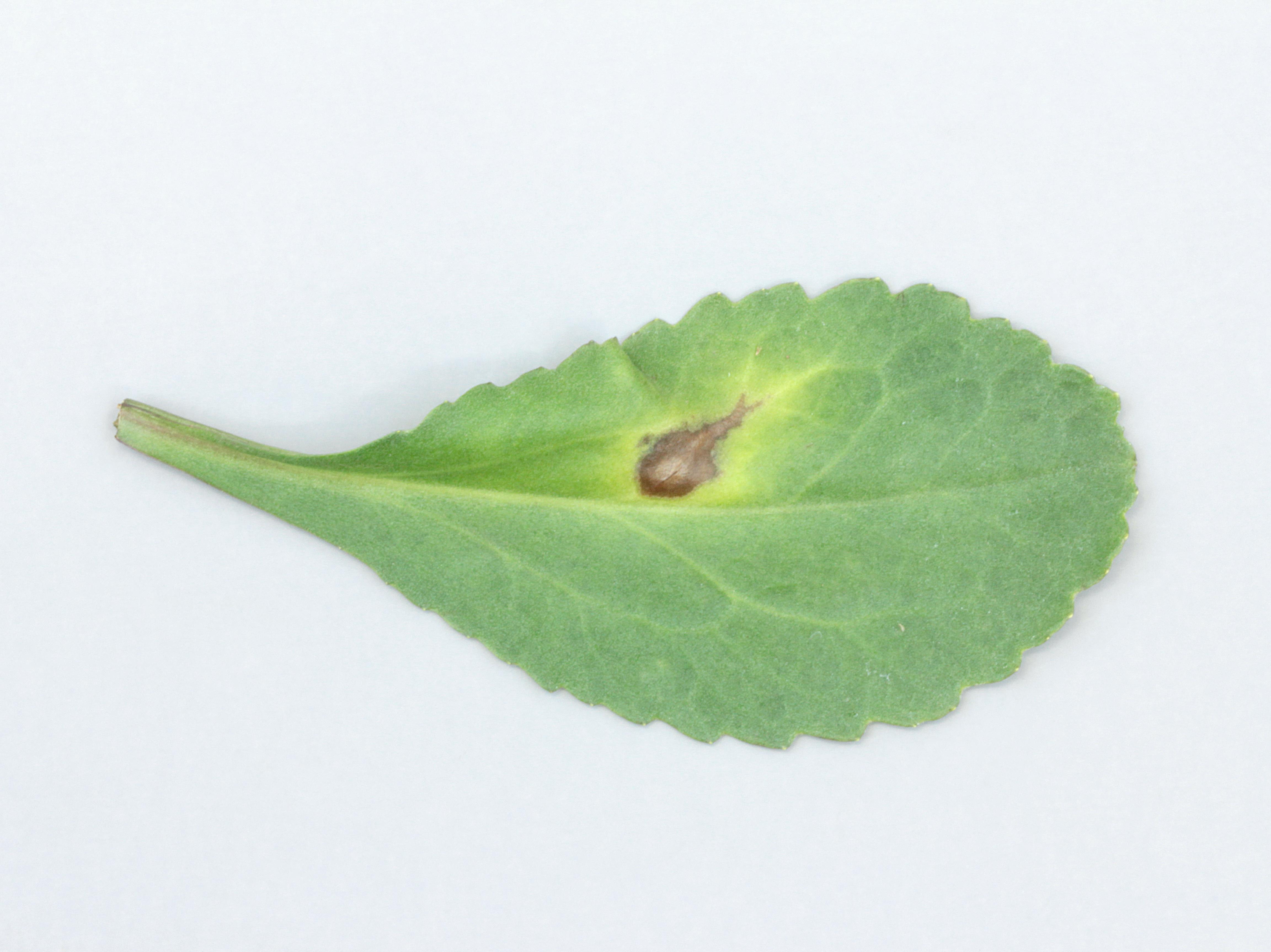 Les feuilles de marguerites cultivées en serre montrent des taches de différente nature selon leur stade de développement. Les taches semblent débuter par l'apparition d'un halo jaune. Un brunissement apparaît ensuite au centre de ce halo. Certaines taches de plus grandes dimensions sont beiges à brunes, sèches et ne portent pas de halos jaunes (non visibles ici). Les taches sont présentes sur les trois niveaux de feuille. Les tests de laboratoire ont révélé la présence du champignon Myrothecium roridum. Ce champignon cause des taches foliaires chez plusieurs plantes ornementales.