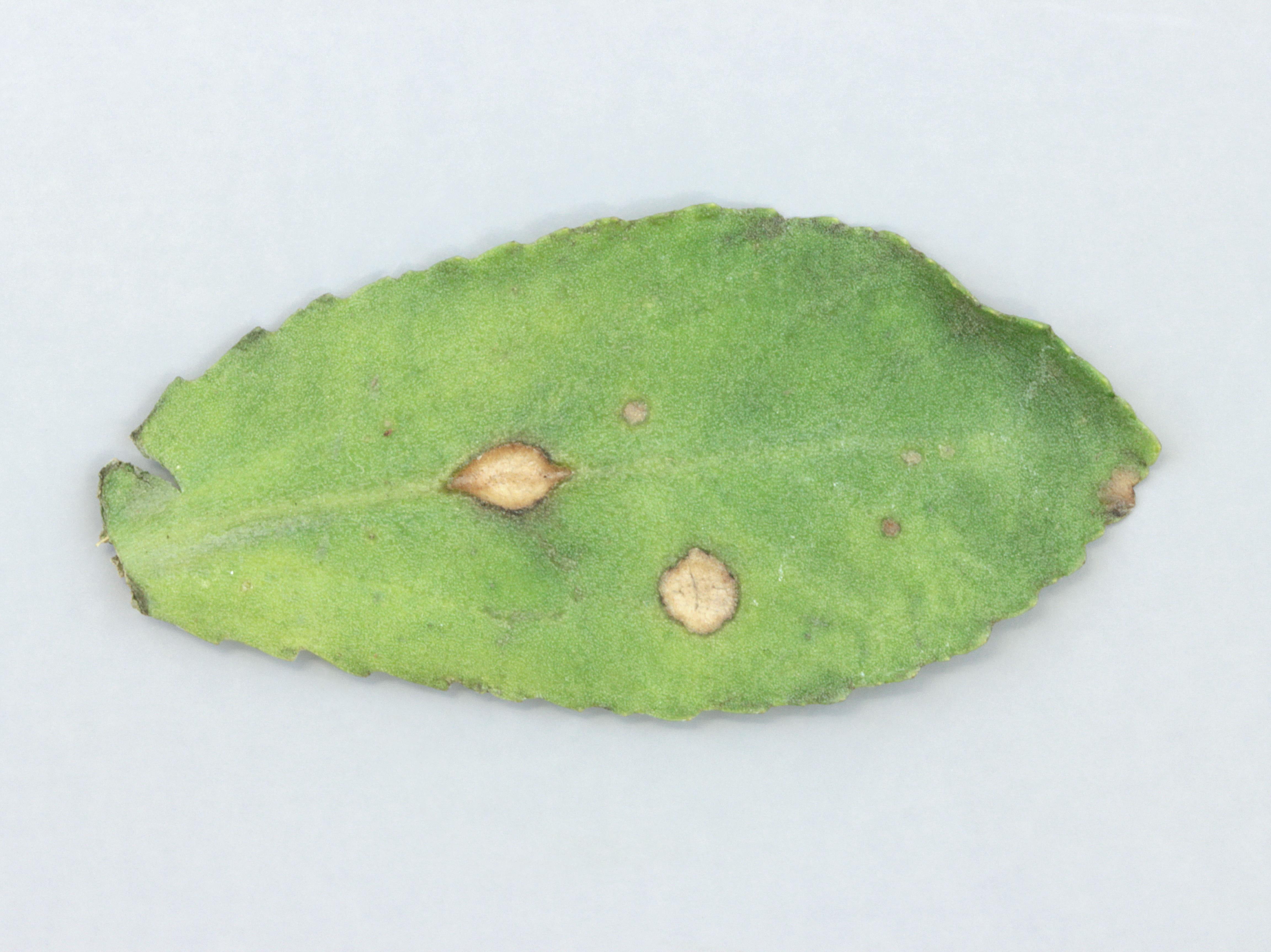 Les feuilles de marguerites vivaces cultivées en serre montrent des taches de différente nature selon leur stade de développement. Les taches semblent débuter par l'apparition d'un halo jaune puis un brunissement apparaît ensuite au centre de ce halo (non visible ici). Certaines taches de plus grandes dimensions sont beiges à brunes, sèches et ne portent pas de halos jaunes. Les taches sont présentes sur les trois niveaux de feuille. Les tests de laboratoire ont révélé la présence du champignon Myrothecium roridum. Ce champignon cause des taches foliaires chez plusieurs plantes ornementales.
