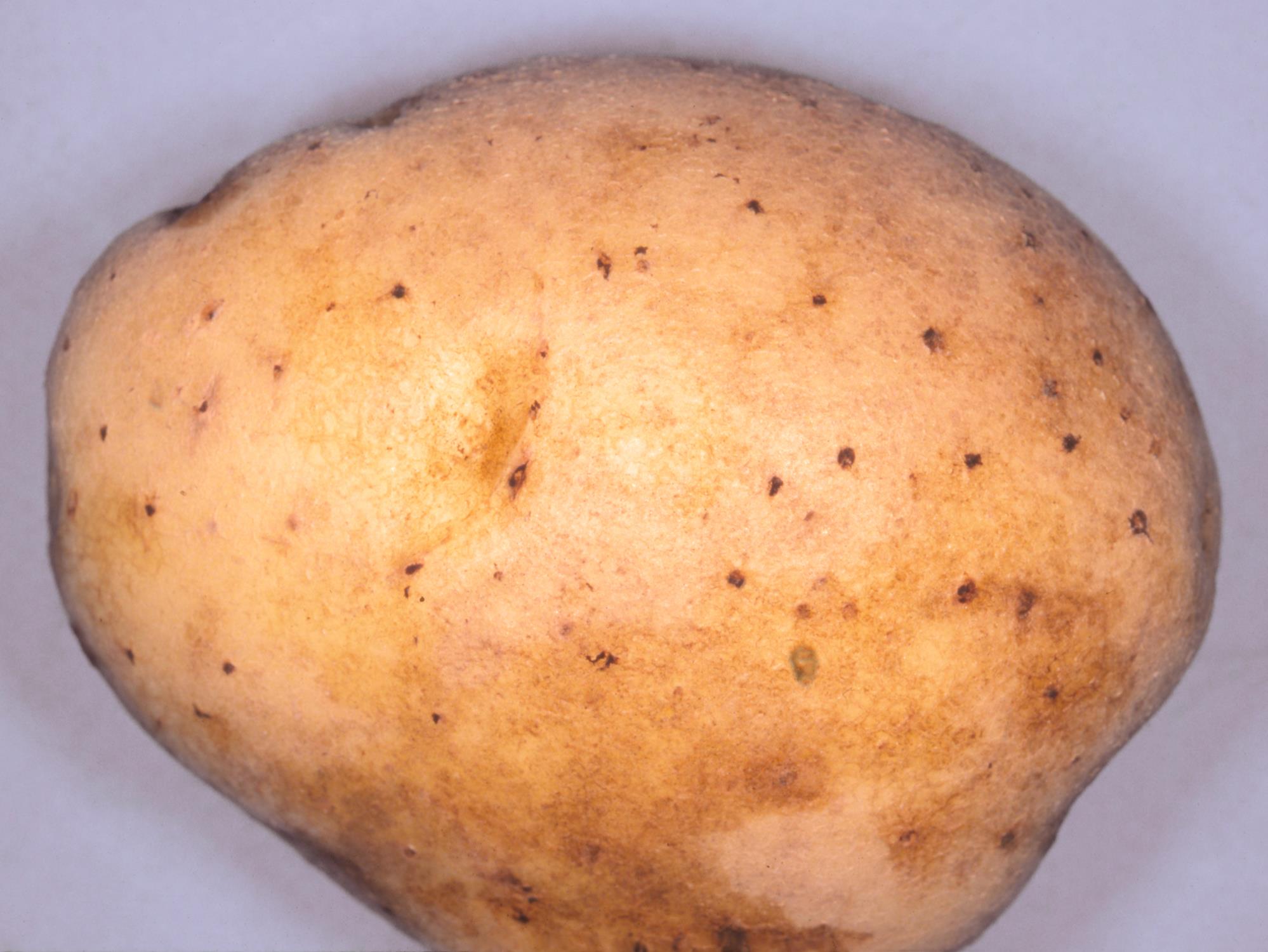 Le périderme d’un tubercule de pomme de terre provenant d’un champ montre la présence de lenticelles brunes à noires, légèrement surélevées, sur une grande surface du tubercule. Les dommages sont superficiels. Les observations microscopiques ont révélé la présence du champignon Rhizoctonia solani, responsable de la rhizoctonie chez la pomme de terre.