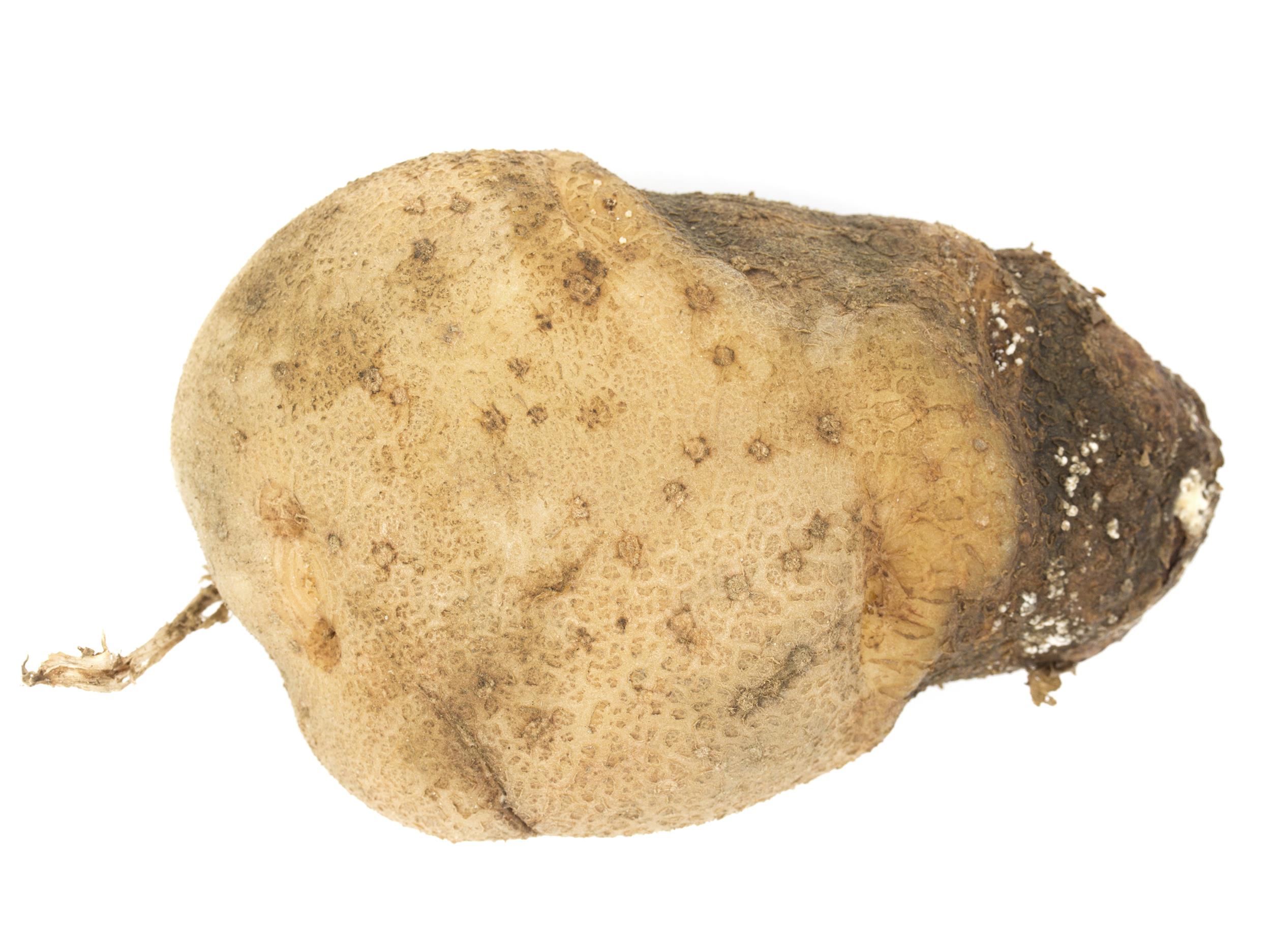 Un tubercule de pomme de terre (cv 'Québec') provenant d’un entrepôt montre des zones de pourriture sèche dans lesquelles de la croissance fongique blanche est parfois présente. La pourriture est souvent localisée au niveau de la couronne. Les zones pourries apparaissent affaissées sur l'épiderme. Les tests de laboratoire ont révélé la présence du champignon Fusarium sp., responsable de la pourriture sèche fusarienne chez la pomme de terre. Notez que le champignon Gliocladium roseum a également été détecté des dommages. Il est reconnu pour causer de la pourriture sèche chez la pomme de terre, mais il n'est généralement pas un agent pathogène de forte virulence. Une souche est même utilisée pour lutter contre certains champignons.