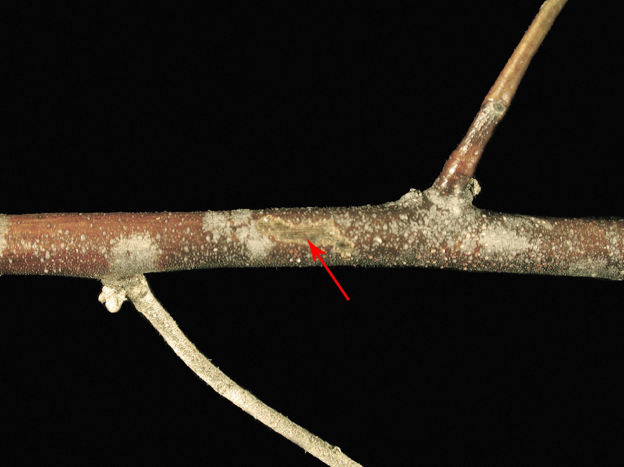 Sur l’écorce d’une branche d’un chalef, présence d’un chancre déprimé brun avec une marge beige (voir flèche). L’écorce est fendue. Les observations microscopiques ont révélé la présence du champignon Phomopsis sp., responsable du chancre phomopsien. Il s’agit probablement de Phomopsis elaeagni rapporté chez l’olivier de bohème.