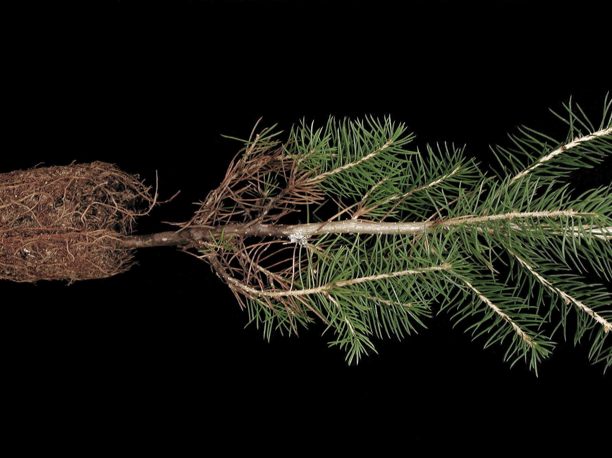 Une vue rapprochée d’un jeune semis d’épinette montre des aiguilles basales avec une brûlure brune, d’apparence sèche. La brûlure couvre toute la surface des aiguilles affectées. Le collet présente également une coloration brune, d’apparence sèche qui se prolonge sur une distance de 5,0 cm sur la tige. Toute la circonférence de la tige est affectée. Le brunissement est en fait la conséquence d’un épais mycélium brun. Les racines sont brunâtres, abondantes et sans symptôme. Les observations microscopiques ont révélé la présence du champignon Thelephora terrestris sur les aiguilles et sur la tige. Ce champignon cause l’étouffement chez les conifères.