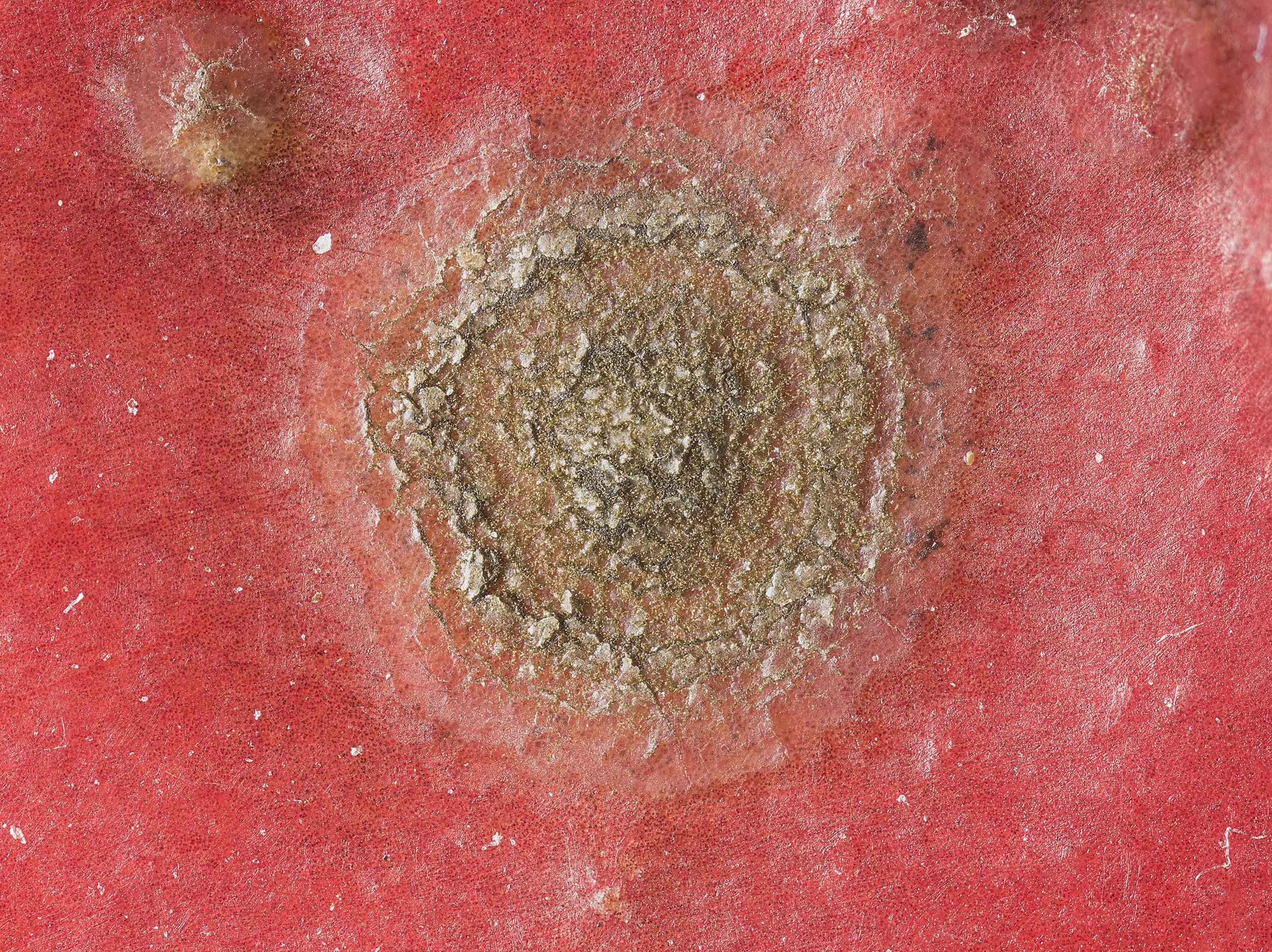 Une vue rapprochée de l’épiderme d’une pomme montre le détail d’une tache superficielle verdâtre, d’environ 2 mm de diamètre. Les observations microscopiques ont révélé la présence du champignon Spilocaea pomi, responsable de la tavelure.