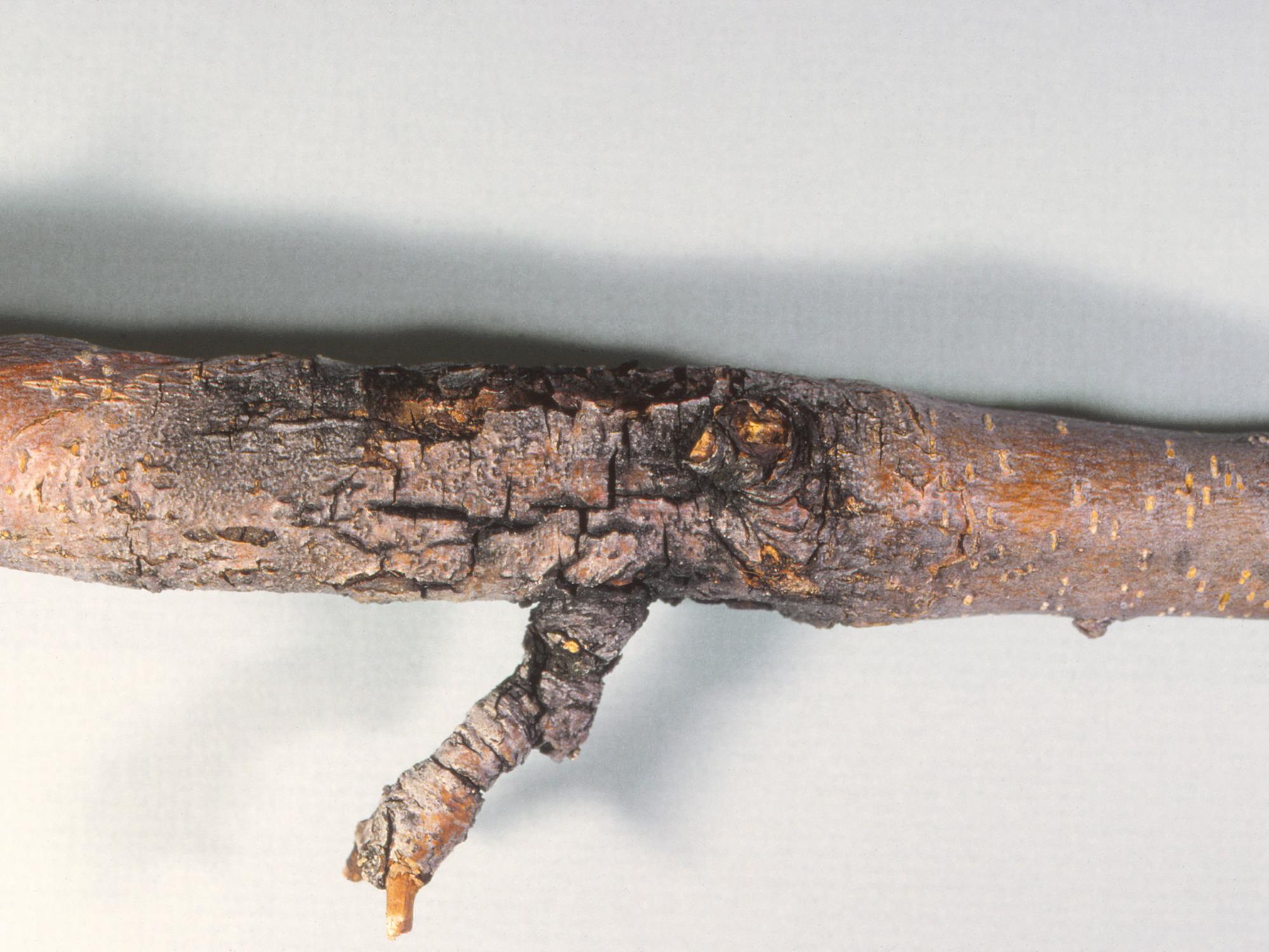 Un segment de branche de pommier montre un chancre brun et une sporulation noire. Le chancre est parsemé de fissures et encercle la branche. Les tests de laboratoire ont révélé la présence du champignon Botryosphaeria sp., responsable du chancre à Diplodia.