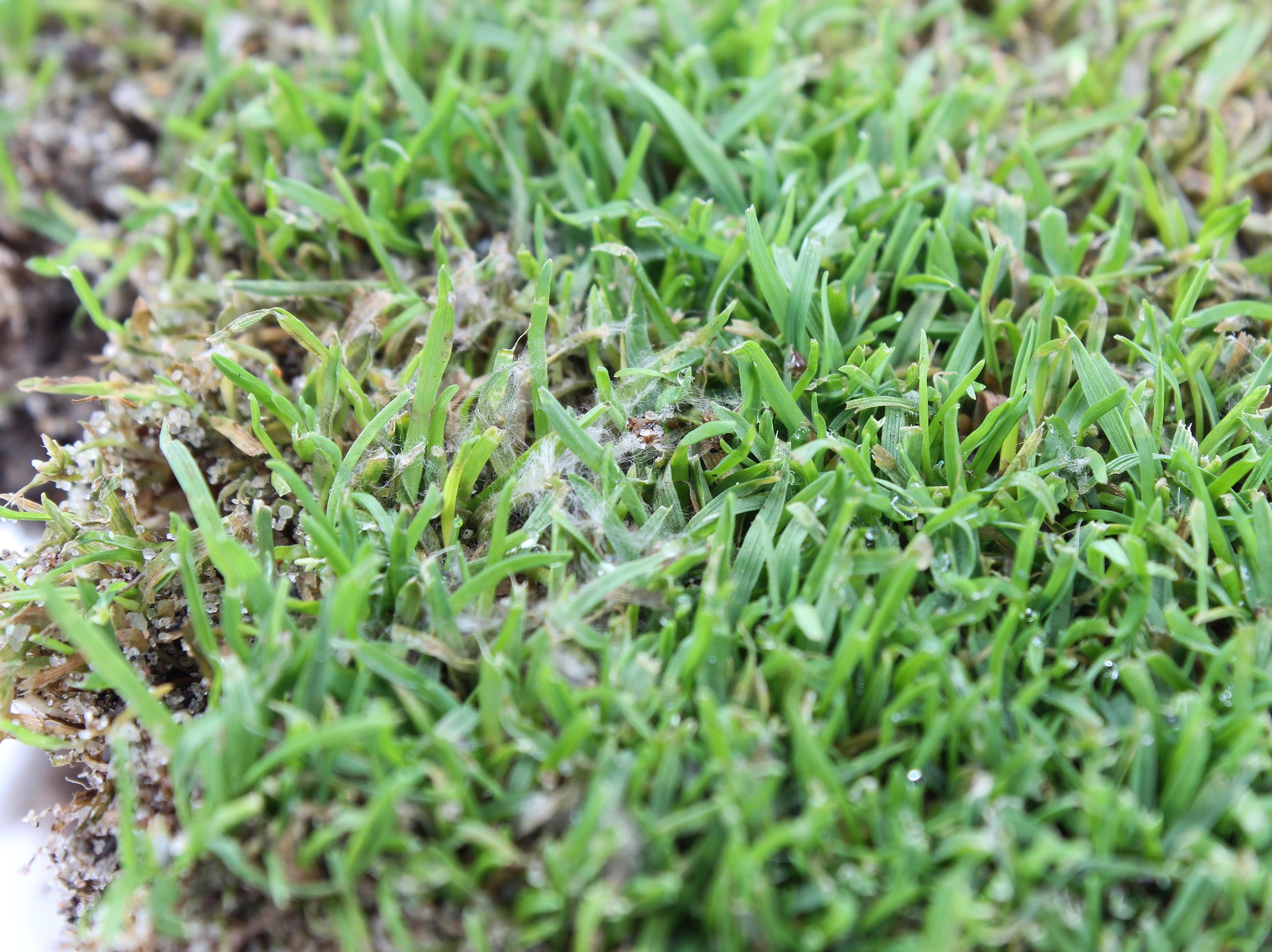Un emporte-pièce de gazon de terrain de golf (pâturin annuel et agrostide) comprenant de nombreuses plantes montre une brûlure humide des feuilles. Les feuilles basales sont touchées en premier et un mycélium blanc est présent dans les zones de feuilles brûlées. Les tests de biologie moléculaire (PCR) ont révélé la présence du champignon Microdochium nivale, champignon qui cause la moisissure nivéale rosée chez les graminées à gazon.