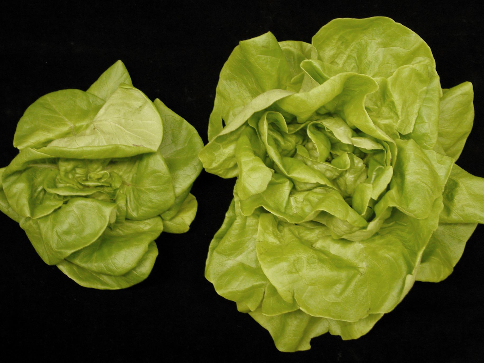 Comparaison entre un plant de laitue Boston sain et affecté (cv 'Sonora'). Le plant affecté a une apparence rabougrie et une croissance réduite qui est environ la moitié de la taille de la laitue saine. Le plant affecté montrait un jaunissement entre les nervures secondaires des feuilles basales et ne présentait pas un pivot unique, car une à deux racines secondaires prenaient naissance au collet. Le système vasculaire du collet était brun et les racines étaient blanches, mais moins bien développées que celles du plant sain. Les tests de laboratoire ont révélé la présence de Pythium dissotocum dans les racines.