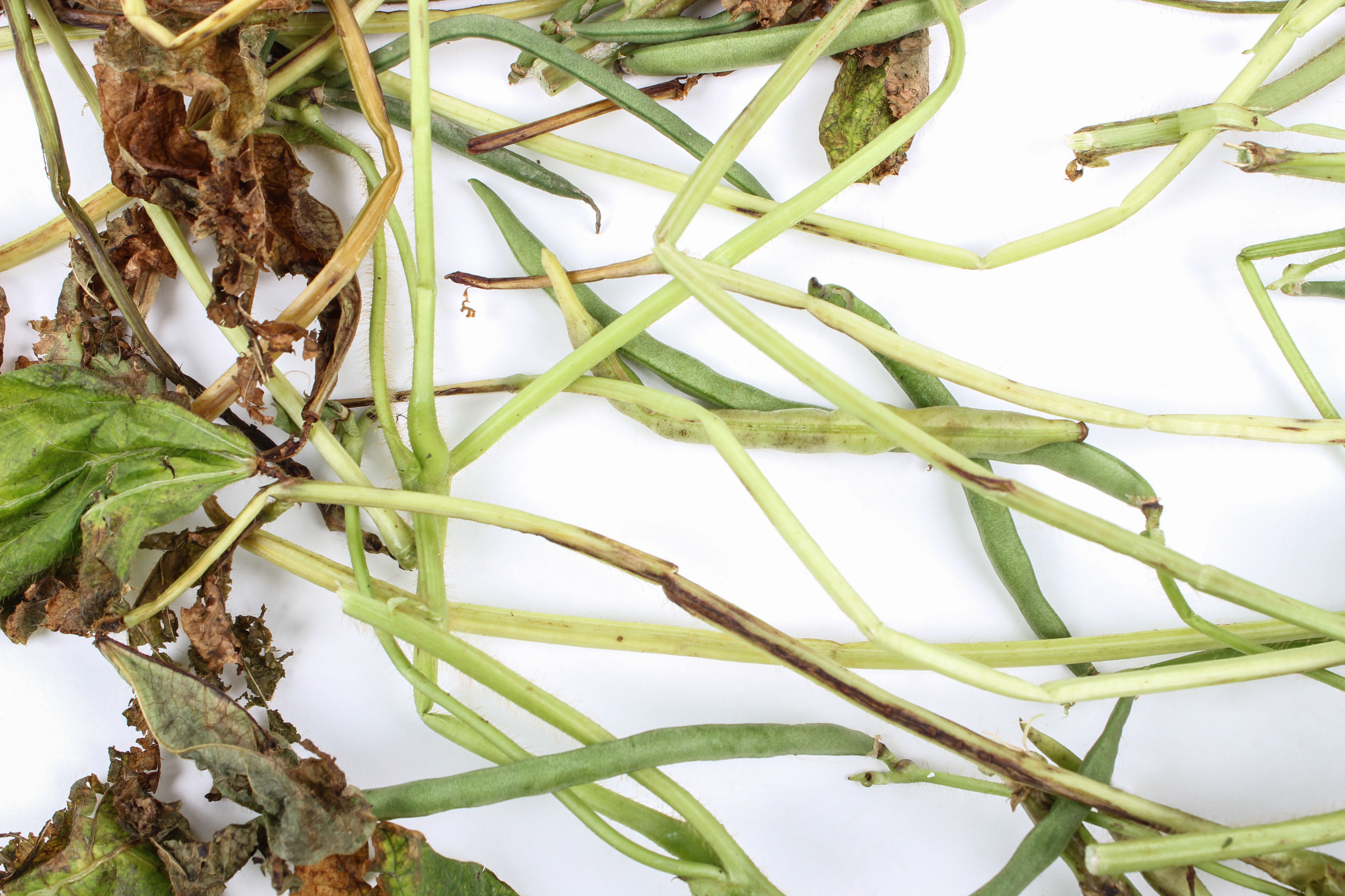 Un plant de haricot vert (cv 'Azuki') est dépérissant. Il montre des brûlures importantes débutant à la marge des jeunes feuilles et progressant sur le limbe et le pétiole. Certaines sections de tige sont affectées. Le limbe est parfois déchiré. Quelques feuilles terminales ont une mosaïque jaune-vert. Les gousses sont sans symptôme. Les tests de laboratoire ont révélé la présence du champignon Colletotrichum sp., responsable de l’anthracnose chez le haricot. Il s’agit probablement de Colletotrichum lindemuthianum. Aucun virus n’a été détecté des feuilles.