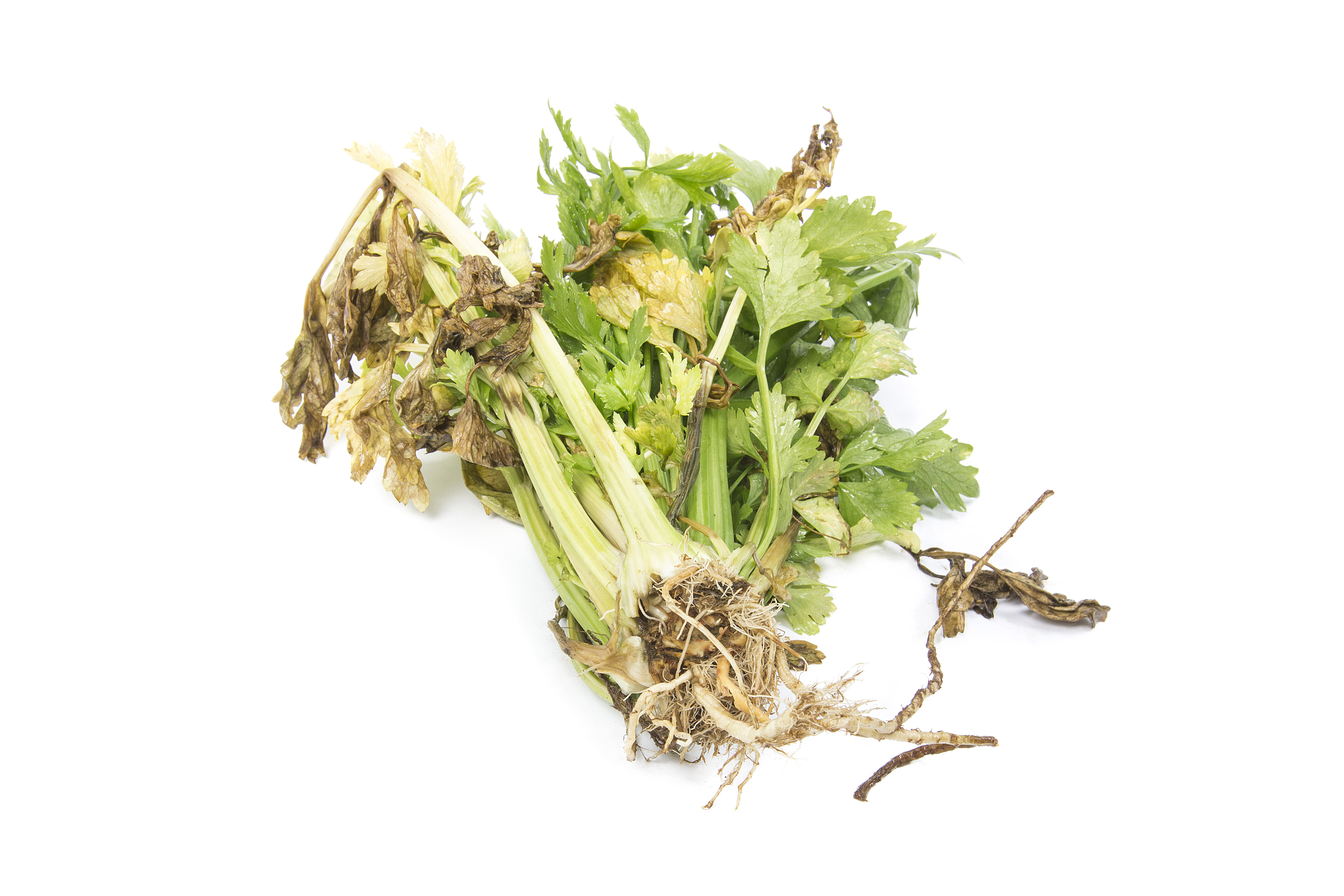 Sur un plant de céleri, le collet et la partie supérieure des racines montrent une pourriture sèche d’aspect liégeux. Le système vasculaire du collet est brun (non visible ici). Les feuilles basales étaient jaunes et flétries. Le système racinaire était composé de nombreuses racines secondaires brunes et humides. Les tests de laboratoire ont révélé la présence du champignon Fusarium oxysporum, responsable de la fusariose vasculaire (jaunisse vasculaire) chez le céleri. Notez que le champignon Pythium ultimum a également été détecté des dommages. Il cause la pourriture des racines.