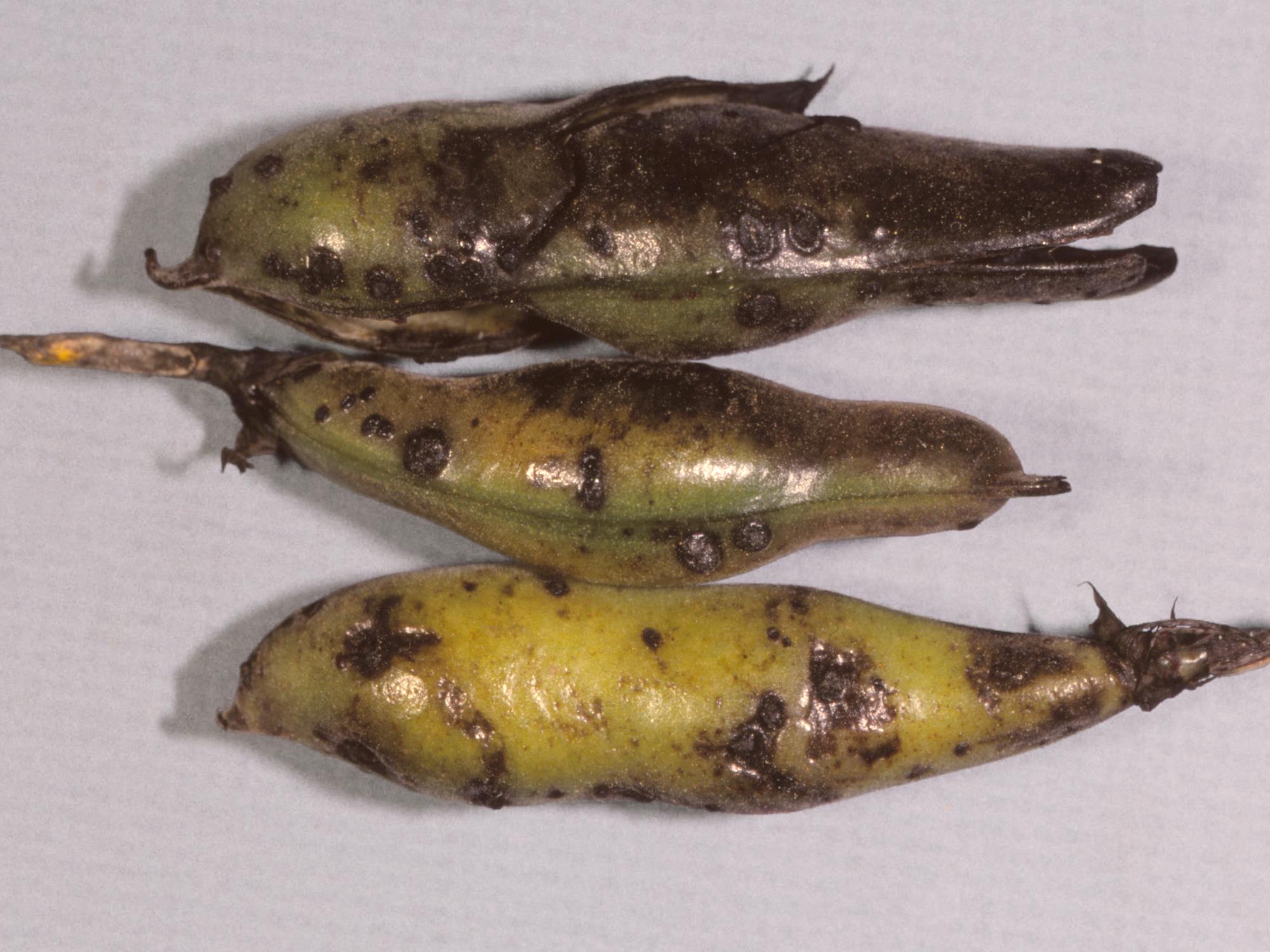 Des gousses montrent des taches noires sur l’épiderme. Les tests de laboratoire ont révélé la présence du champignon Botrytis sp., responsable de la tache chocolat chez la gourgane.