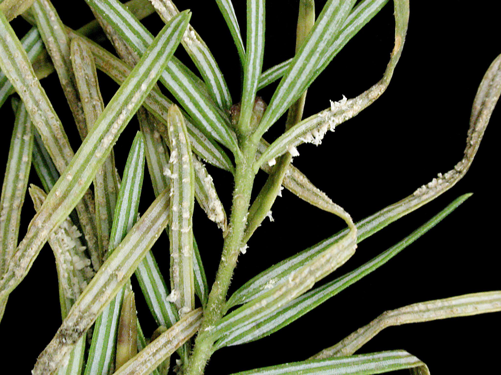 Une branche de sapin montre de jeunes aiguilles jaunes parmi les aiguilles saines. À la face inférieure des aiguilles affectées, des structures cylindriques blanches sont visibles le long des lignes de stomates. Les observations microscopiques ont révélé la présence d’écidies et d’écidiospores d’un champignon qui cause une rouille chez le sapin. Il s’agit probablement du genre Uredinopsis spp. (six espèces recensées) mais le genre Milesina spp. (deux espèces recensées) est également possible. Ces deux rouilles sont les seules à produire des écidies blanches. Elles ne peuvent être différentiées qu’à l’aide de tests spécifiques. La conseillère agricole mentionne que tous les plants de la plantation sont affectés.