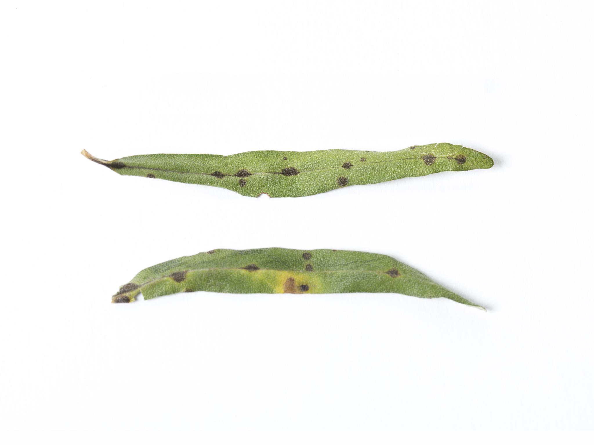 Taches circulaires noires à la face supérieure de feuilles d’argousier, symptôme de Colletotrichum acutatum.