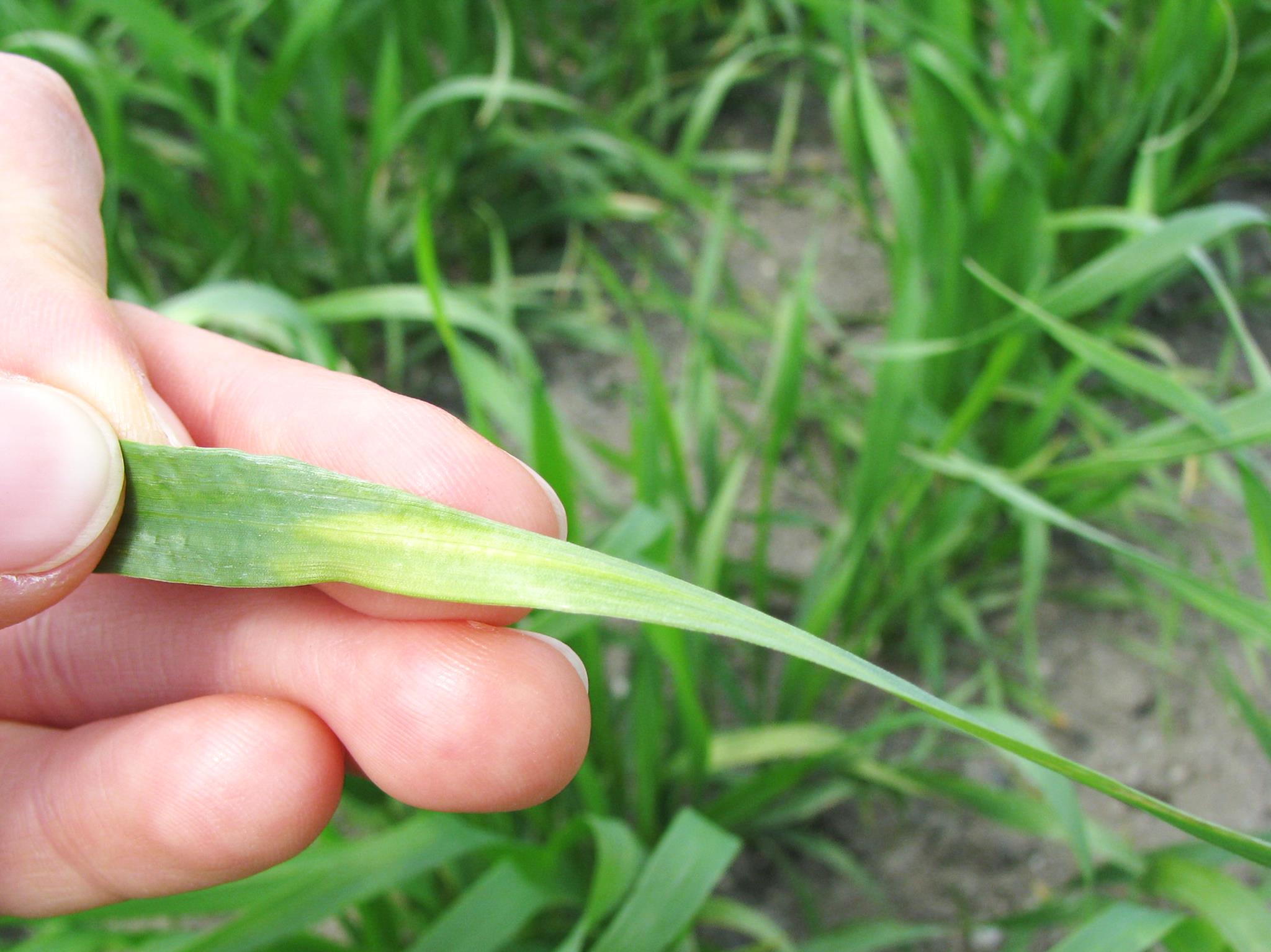 Une feuille de blé présente un jaunissement des tissus. Ce symptôme est attribuable à l’herbicide PumaMD (fénoxaprop-p-éthyl). Un stress climatique (nuits fraîches et journées chaudes) peu avant ou peu après l’application de l’herbicide aurait provoqué l’apparition de ce symptôme. Le rendement de la culture n'en serait pas affecté.