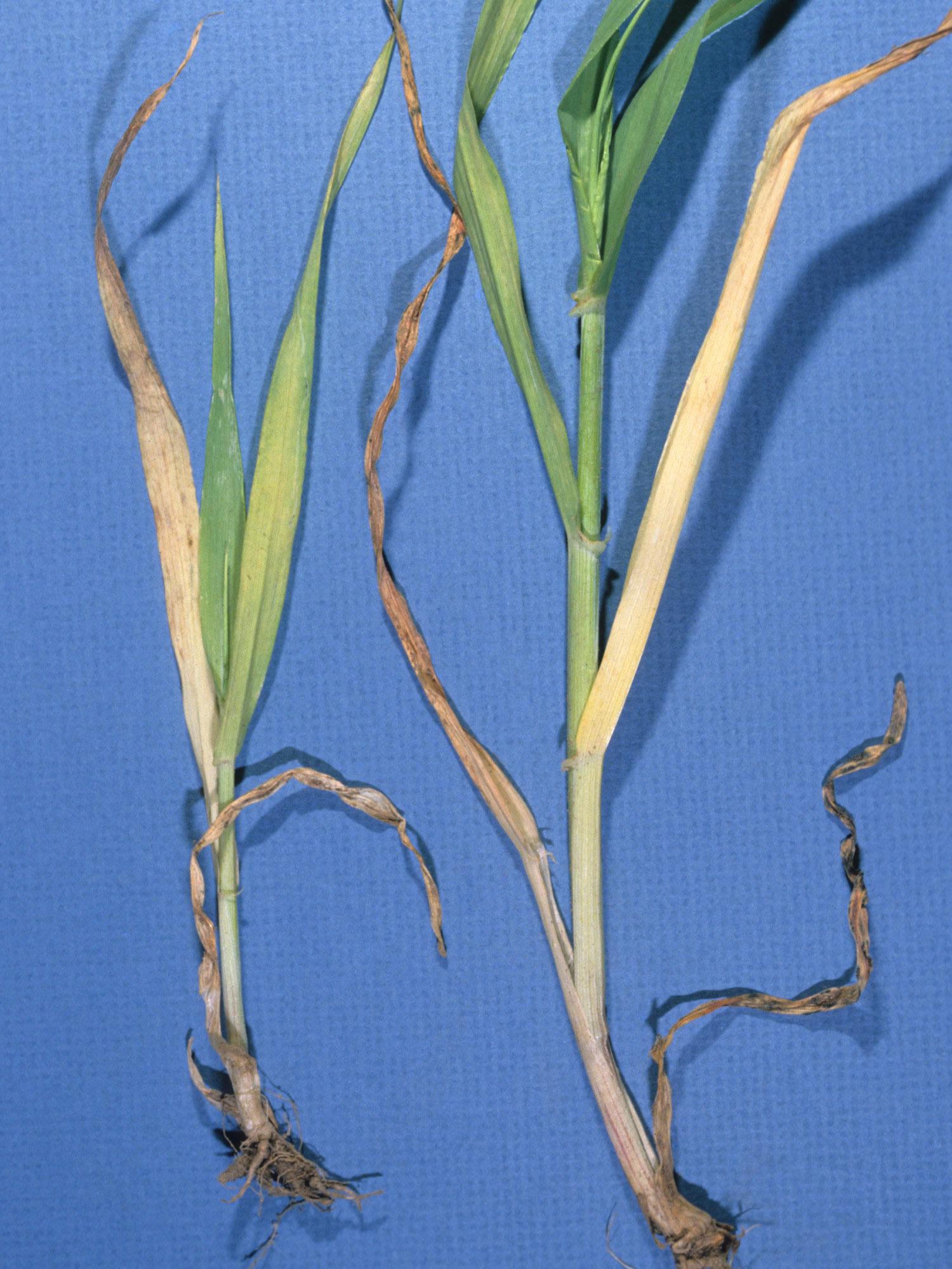 Les plants d’orge présentent des feuilles basales desséchées, brûlées ou jaunies. Le système racinaire est également peu développé. Ces symptômes sont attribuables aux effets de résidus d’atrazine sur l’orge qui a succédé à une culture de maïs.
