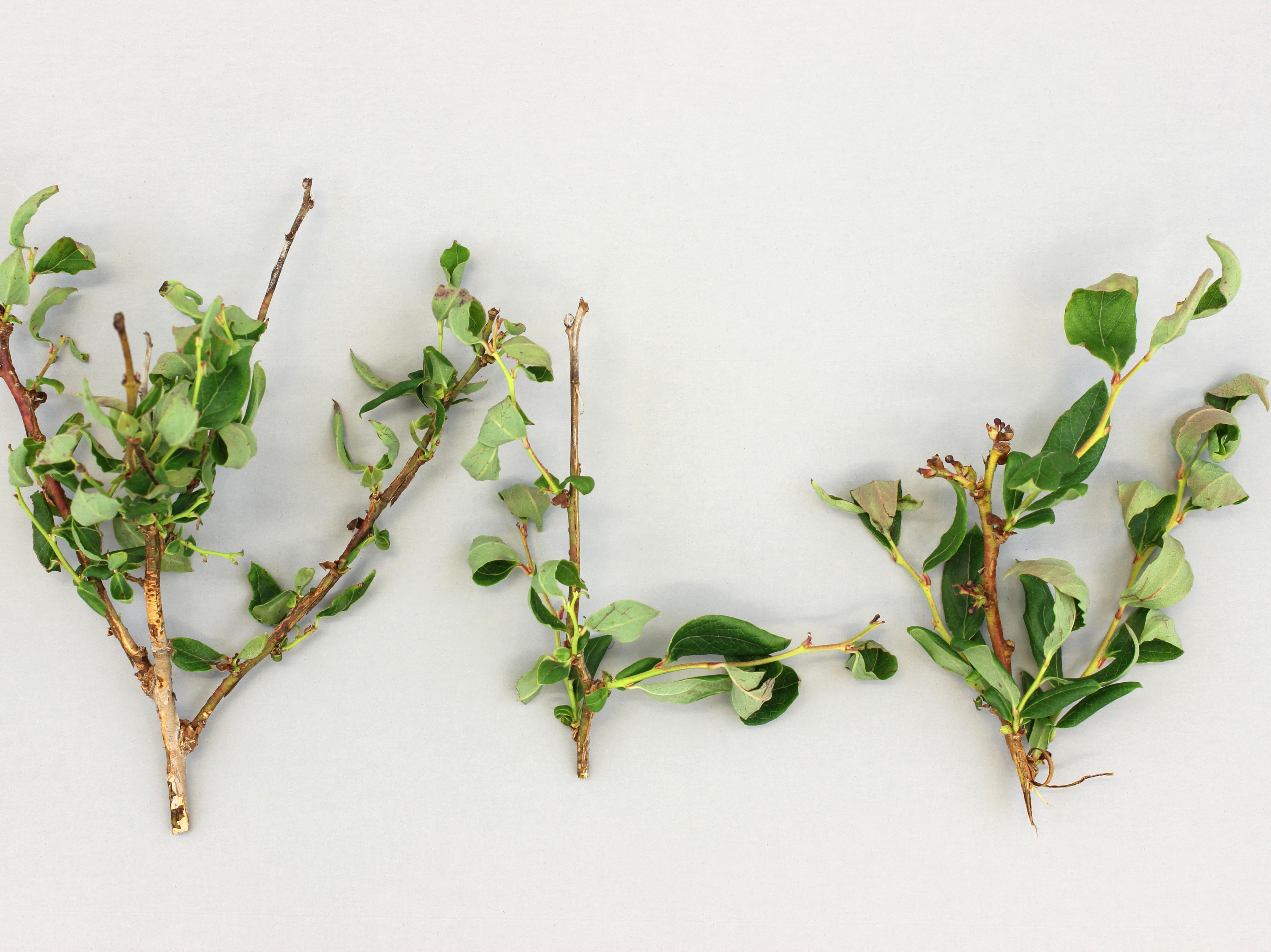 Toutes les feuilles de ce bleuet en corymbe (cv 'Duke') sont déformées, rabougries et en forme de cuillère. Aucun virus n’a été détecté des dommages, mais le phytoplasme du flétrissement du bleuet a été confirmé par le séquençage de son génome. Par contre, les symptômes observés sur cet échantillon ne correspondent pas à ceux causés normalement par les phytoplasmes soit du jaunissement et du rougissement des feuilles et des feuilles portées en rosette parce que les entrenœuds sont très courts. Les observations visuelles, jumelées aux informations sur les pratiques culturales, confirment que les malformations foliaires sont attribuables à une phytotoxicité par l’herbicide clopyralide (LONTREL 360). Les plants affectés proviennent d’une bleuetière de deuxième année de production et l’année précédente, un traitement au LONTREL 360 a été fait pour éradiquer les mauvaises herbes. Lors du traitement, il y a probablement eu contact entre l’herbicide et les plants.
