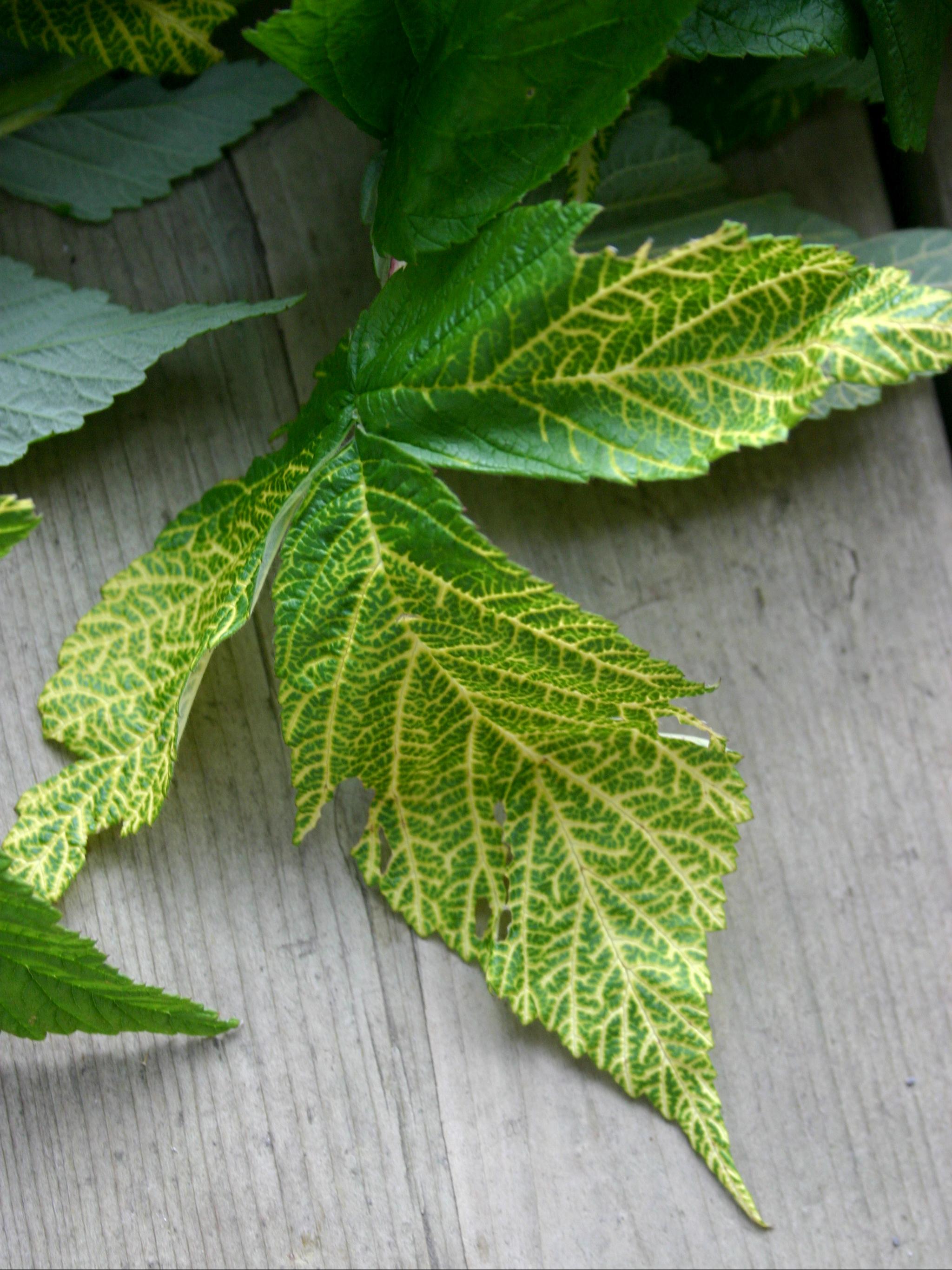 Sur une feuille de framboisier, les nervures principales et secondaires sont complètement jaunes et le limbe entre les nervures demeure vert. Ces symptômes sont causés par une phytotoxicité à l'herbicide terbacil (SINBAR) et affectent principalement les vieilles feuilles. Les liens internet mentionnés dans cette fiche montrent des symptômes similaires chez le rosier et le fraisier.
