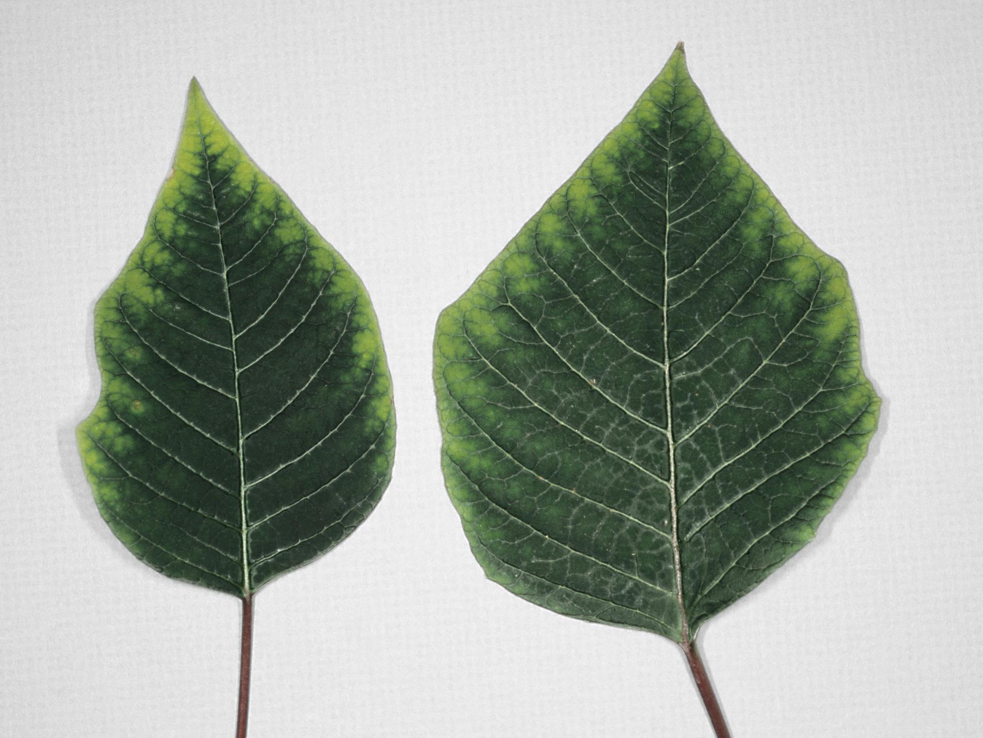 Des feuilles de poinsettia montrent un jaunissement de la marge qui progresse entre les nervures. Ce symptôme est causé par une phytotoxicité au régulateur de croissance CYCOCEL (chlorure de chlorméquat). Le producteur a fait une application foliaire en utilisant le produit à une concentration trop élevée (> 1500 ppm). Les nouvelles feuilles formées après le traitement sont sans symptôme.