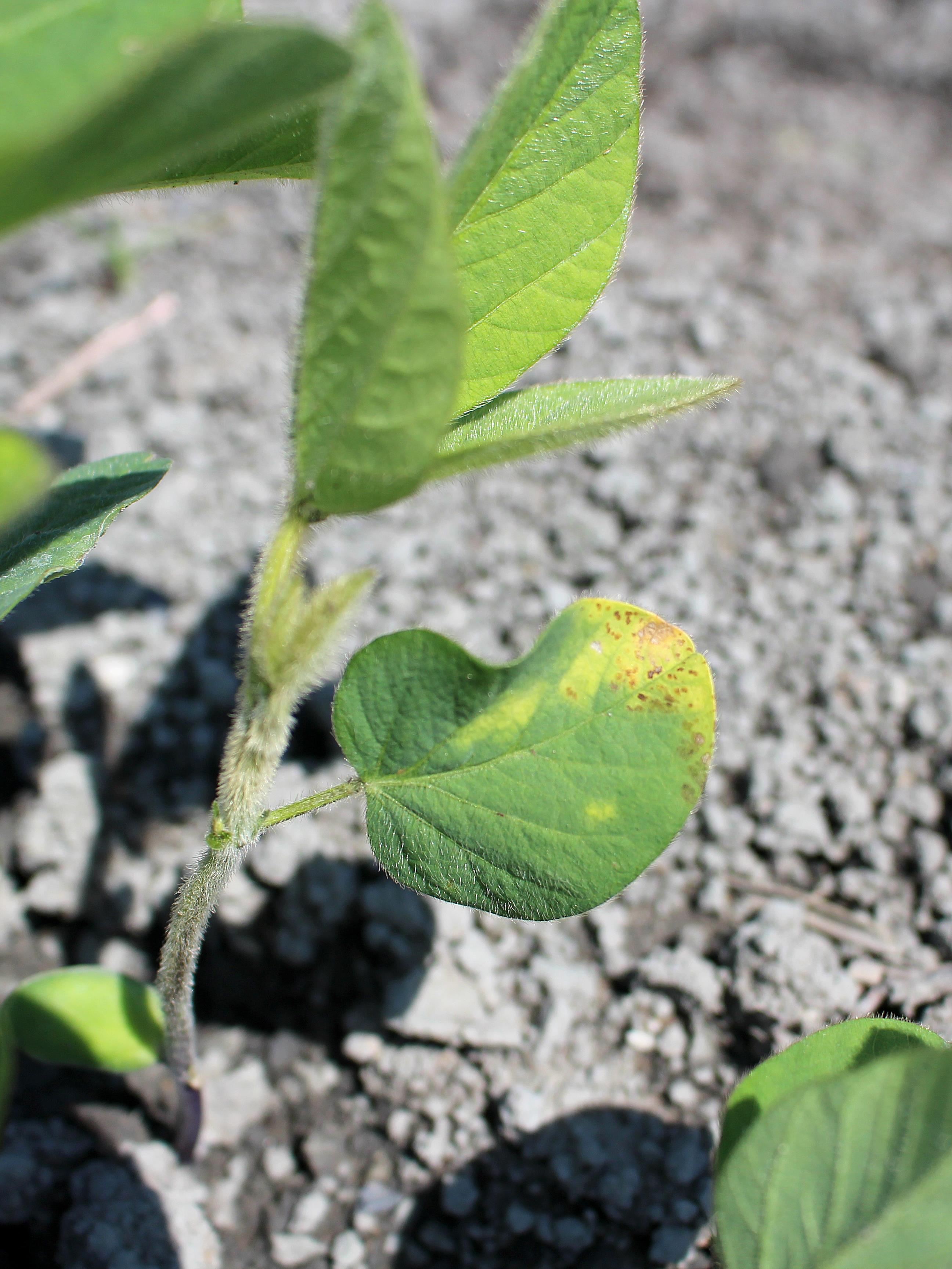 Une feuille basale de soya montre un jaunissement débutant à l’apex et progressant vers le limbe. Le symptôme est attribuable à l’application en prélevée de SENCOR® 75 DF, à 200 % de la dose recommandée. L’étiquette du produit mentionne que les traitements utilisant des doses supérieures à celles recommandées peuvent causer des brûlures, un jaunissement ou un rabougrissement de la culture. De fortes pluies, survenant peu de temps après le traitement, peuvent aussi endommager la culture, en particulier dans les zones mal égouttées où l’eau peut stagner plusieurs jours.