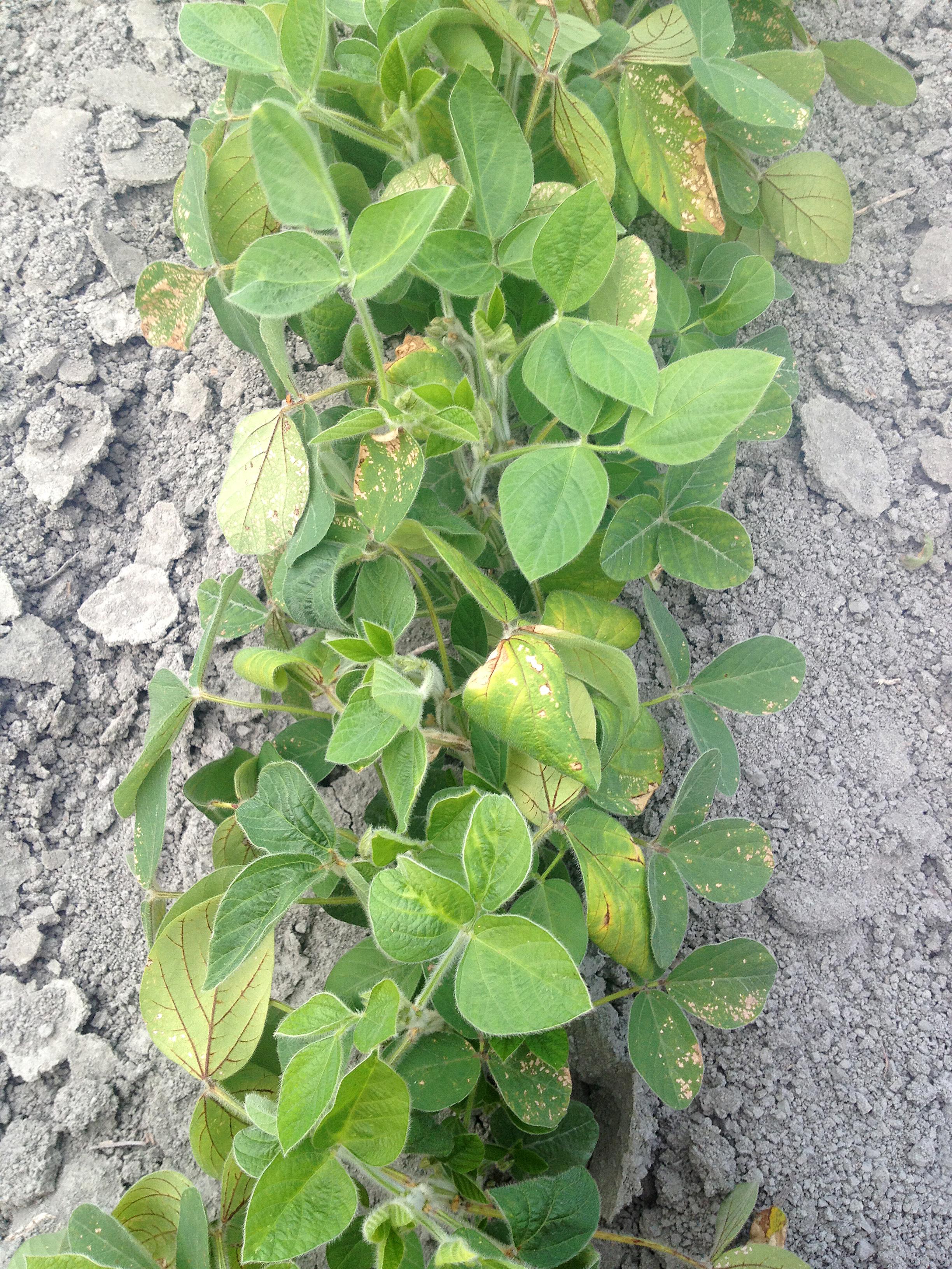 Feuilles de plants de soya avec taches et jaunissement