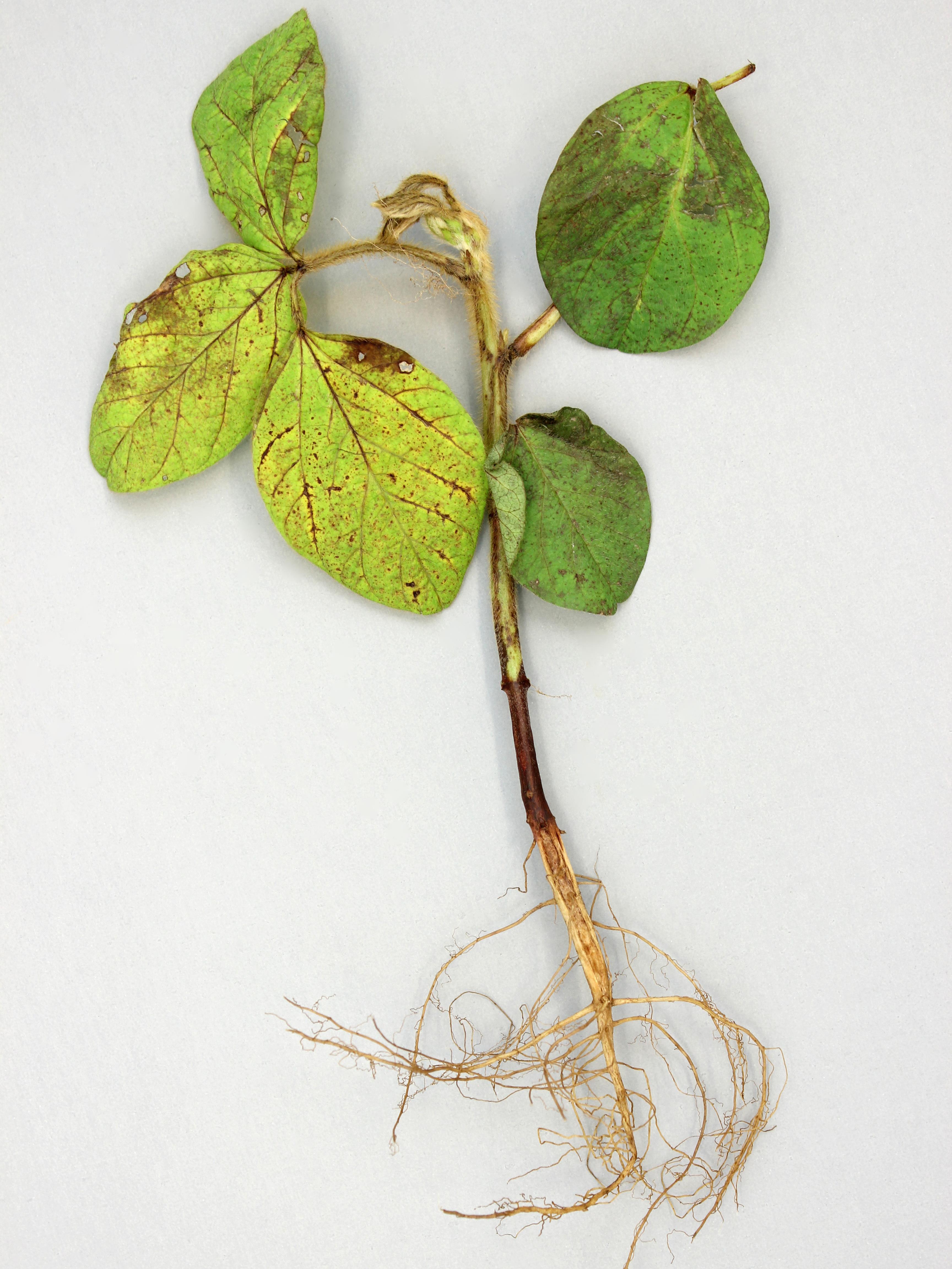 Sur un plant de soya (cv 'Colt'), les nervures des feuilles sont brunes à violettes et le limbe est jauni. Le plant a une faible croissance pour la période de l'année (juillet) et ne dépasse pas 15 cm de hauteur. Le nanisme, des chloroses sur les feuilles et des malformations du système racinaire sont des symptômes ou dommages provoqués par l’herbicide GUARDIAN. Les symptômes observés sur le plant de soya sont caractéristiques d’une phytotoxicité à un des deux herbicides du GUARDIAN PLUS WD, le CLASSIC 25 DF (chlorimuron-éthyle). L’autre herbicide contenu dans le GUARDIAN PLUS est la flumioxazine.