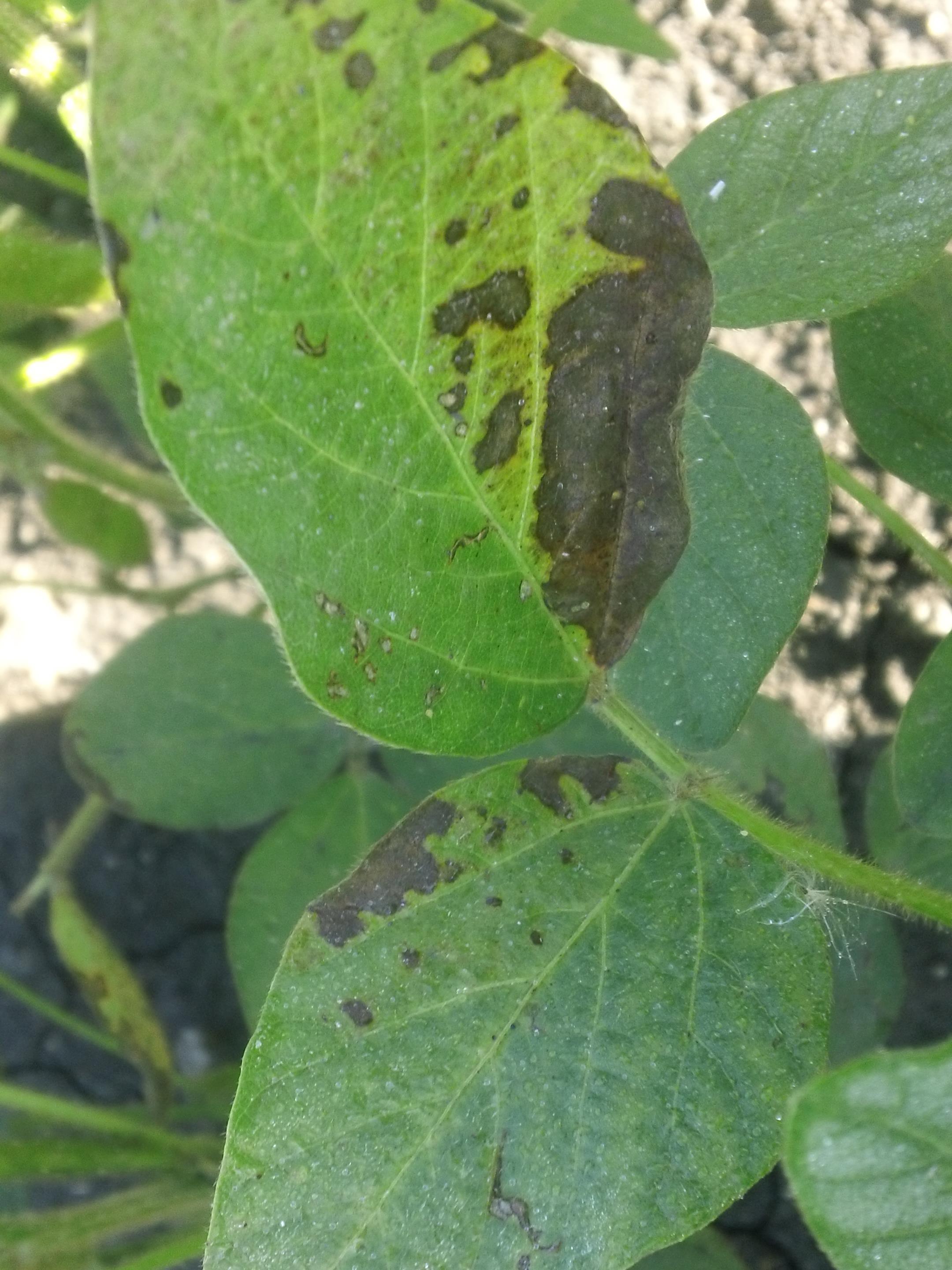 Une feuille de soya montre des brûlures résultant de l’application en prélevée de SENCOR® 75 DF (métribuzine), à 200% de la dose recommandée à l’étiquette. Augmenter la dose d’herbicide appliqué, ici la métribuzine, peut causer des brûlures, un jaunissement ou un rabougrissement de la culture. De fortes pluies survenant peu de temps après le traitement, peuvent endommager la culture, particulièrement dans les zones mal égouttées où l’eau peut rester pendant plusieurs jours.