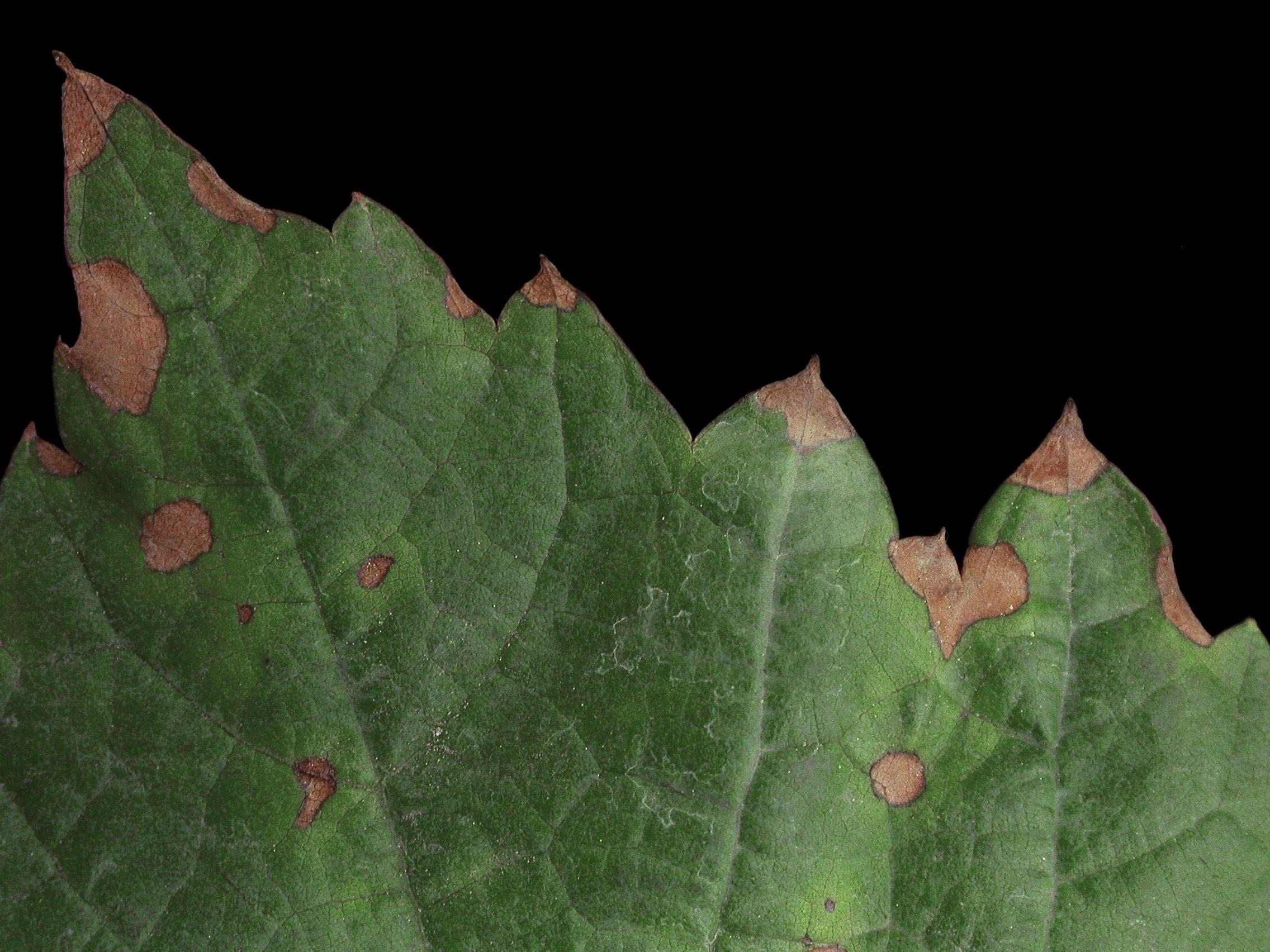 Une feuille de vigne montre des taches brunes avec une bordure brun foncé à noire, plutôt circulaire, et d’une apparence sèche. Quelques taches présentent un halo vert pâle à jaune. Elles sont réparties au hasard sur la feuille et dans ce vignoble, 90 % des plants sont affectés. Ces taches sont causées par une phytotoxicité à l’herbicide GRAMOXONE à la suite d’une dérive au champ.