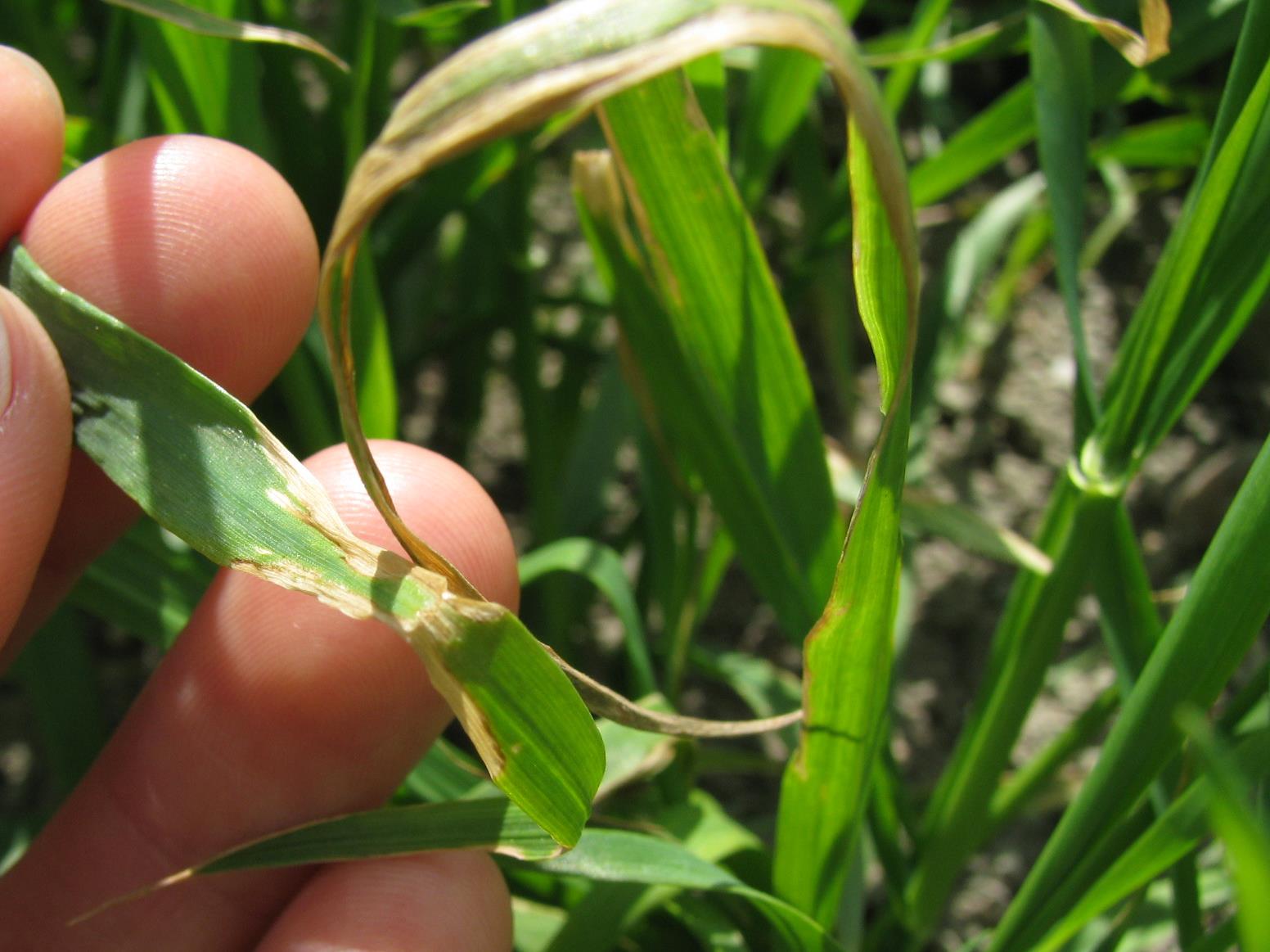 Des feuilles de blé présentent un blanchiment et une brûlure des tissus, d'étendue variable, à plusieurs endroits sur le limbe ou à la marge du limbe. Ces symptômes sont causés par l’herbicide PumaMD (fénoxaprop-p-éthyl). Un stress climatique (nuits fraîches et journées chaudes) peu avant ou peu après l’application de l’herbicide aurait provoqué l’apparition de ces symptômes. Le rendement de la culture n'en serait pas affecté.