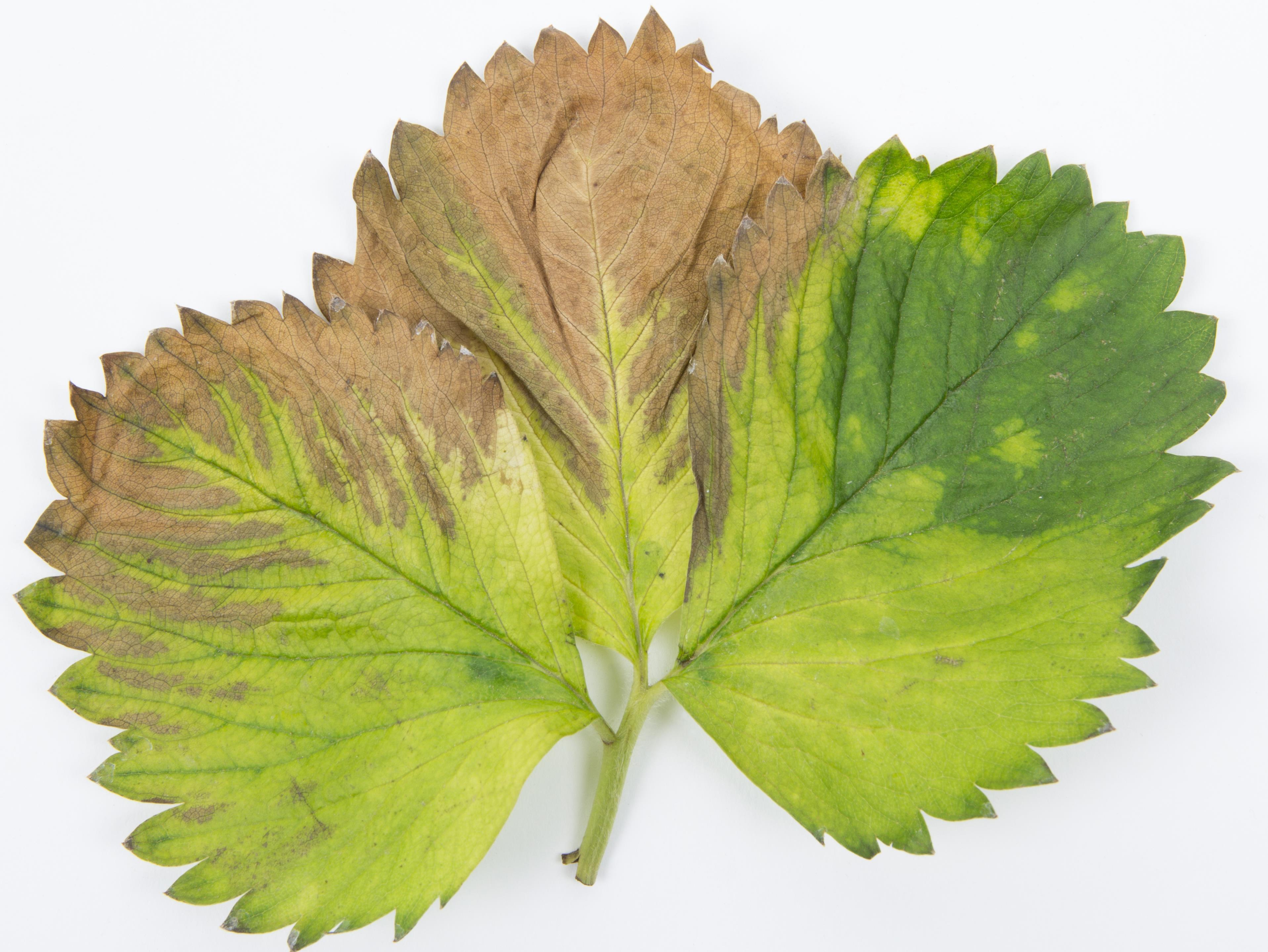 Une feuille de fraisier présente un jaunissement important et des brûlures. Les plus vieilles feuilles des plants sont plus fortement touchées. Ce symptôme est très répandu dans la plantation. Un dosage chimique a révélé une quantité suffisante d'atrazine, et de son métabolite de dégradation (le déséthyl-atrazine), pour causer les symptômes observés. L'atrazine n'est pas homologuée dans la culture de la fraise. Le s-métolachlore a aussi été détecté lors du dosage; ce produit est homologué dans la fraise et n'est pas lié aux présents symptômes. Il existe une forte probabilité que des résidus d'atrazine dans la cuve du pulvérisateur soient en cause.