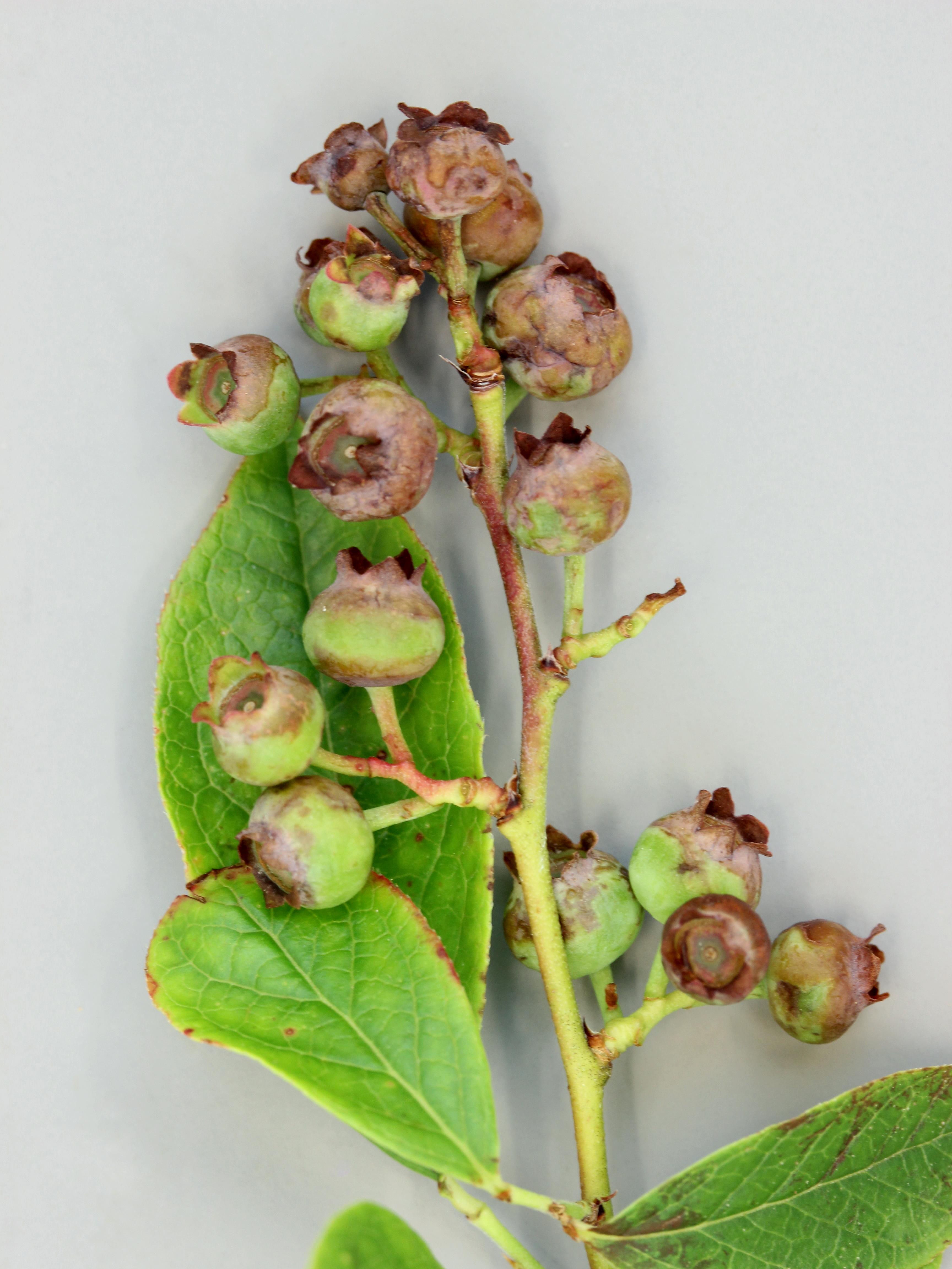 Brûlures sur feuilles et fruits de bleuet en corymbe
