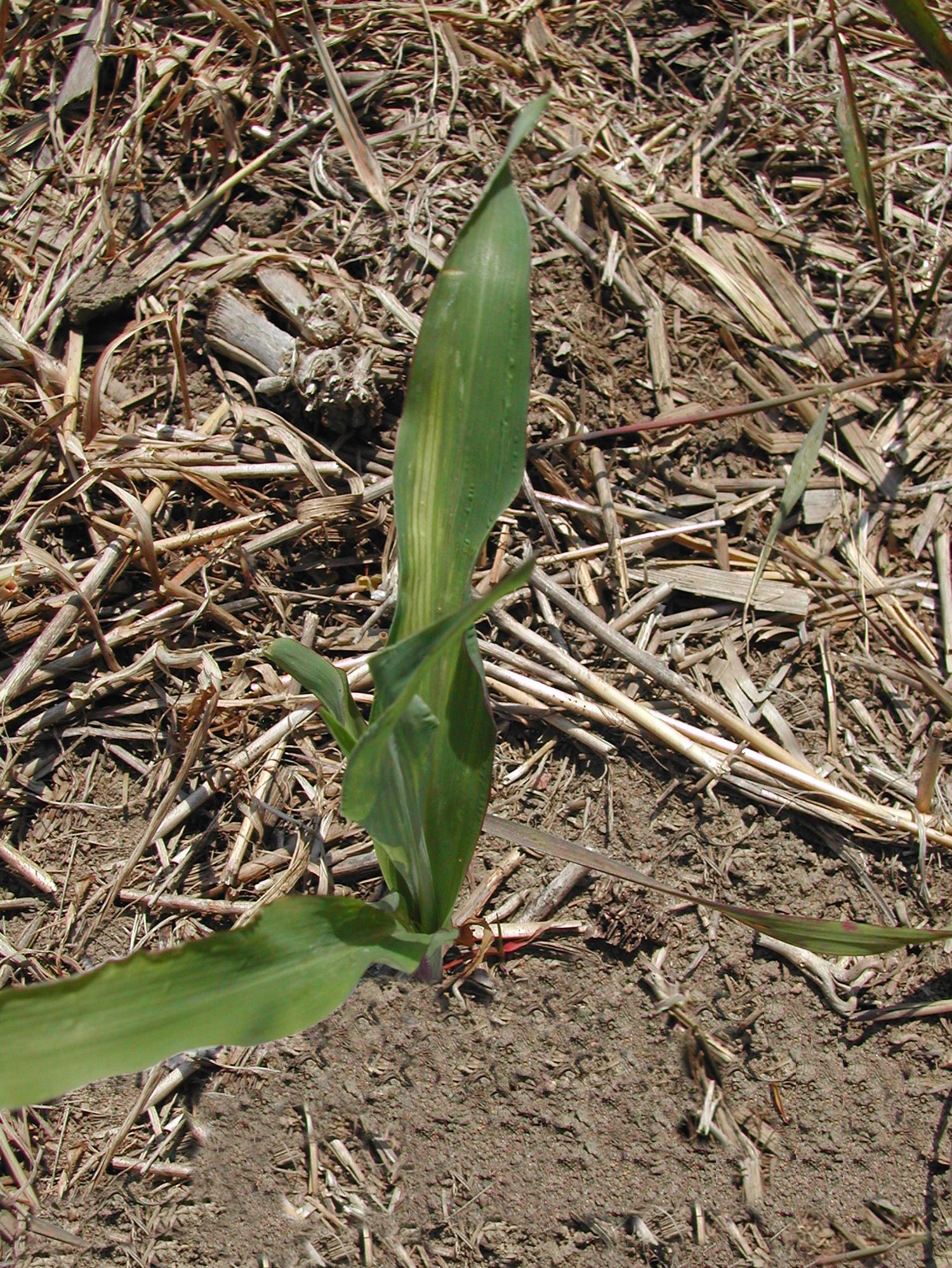 Sur les feuilles basales d’un plant de maïs grain et fourrager d’une production biologique, présence d’un jaunissement à blanchiment du limbe. Les nouvelles feuilles sont déformées mais encore vertes. Ces symptômes sont apparus à la suite d’une dérive de l’herbicide glyphosate appliqué dans un champ de maïs voisin.