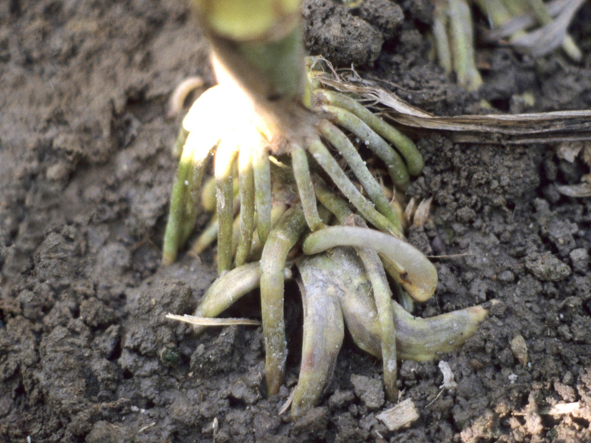 Racines déformées d'un plant de maïs grain et fourrager