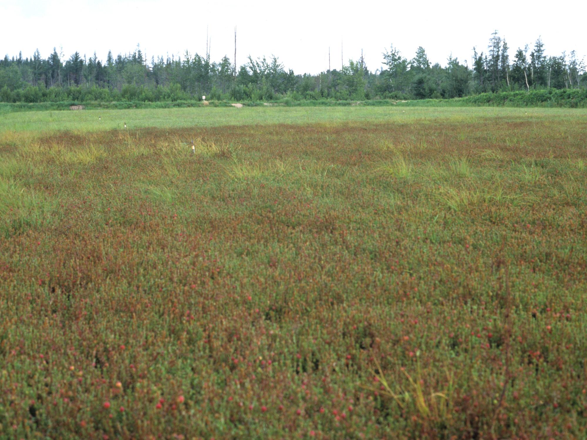 Une vue d’ensemble d’un champ de canneberge montre un brunissement de l’extrémité des plants. Les feuilles terminales et les crochets sont rouges et l’épiderme des fruits est ponctué de petites taches noires (non visible ici). Ces symptômes sont causés par une phytotoxicité au parathion. Ces symptômes apparaissent au champ lorsque le volume d’eau utilisé lors de l’application est trop faible, ce qui a pour effet de concentrer la matière active.