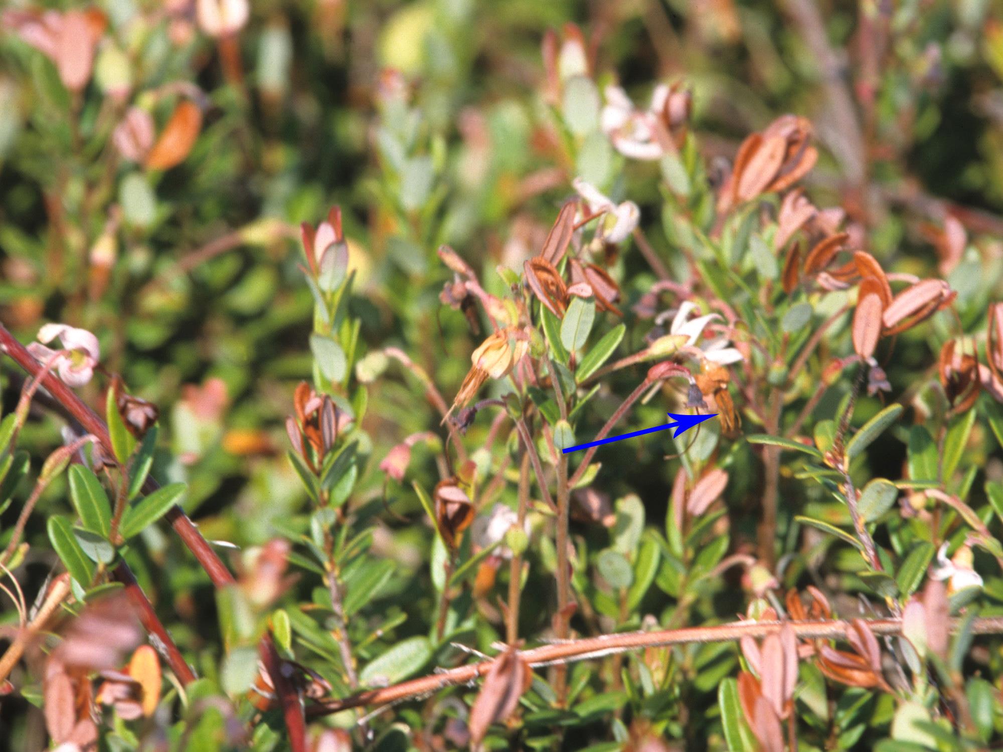Les feuilles terminales des plants de canneberge rougissent, brunissement, puis meurent. Les fleurs sont brûlées (voir flèche). Les symptômes sont causés par une phytotoxicité à l’herbicide glyphosate. Les dommages sont apparus à la suite de l’utilisation d’un humecteur à mèches pour appliquer le glyphosate sur les mauvaises herbes en postlevée. L’applicateur est entré en contact avec l’extrémité des plants en voulant détruire des mauvaises herbes plus hautes que les plants de canneberge. Ces symptômes sont localisés au champ. Le glyphosate est homologué dans la culture de la canneberge.