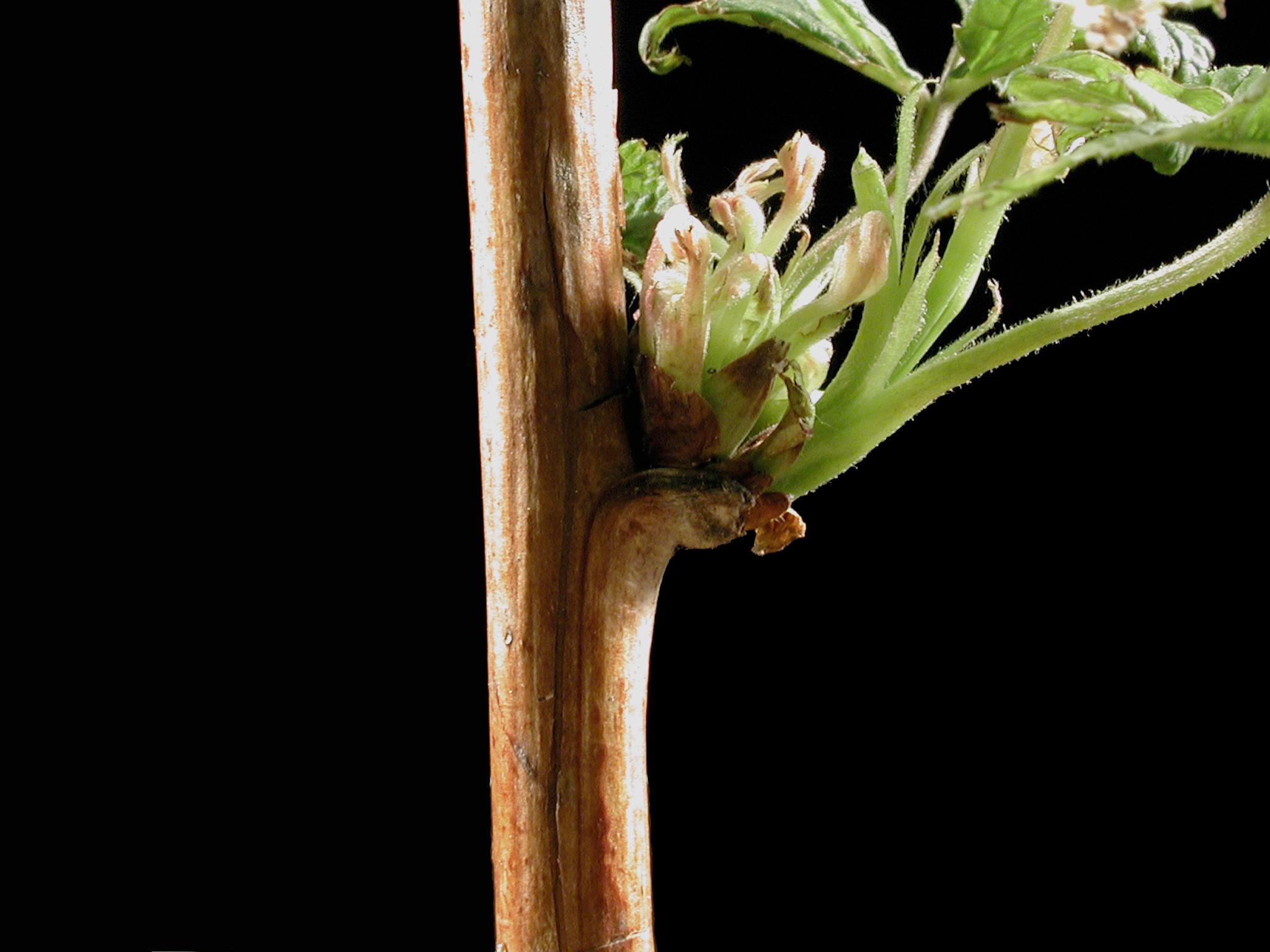 D'importantes malformations du feuillage sont observées sur ce plant de framboisier. Elles se caractérisent par une réduction du limbe et certaines folioles sont en forme de cuillère. Ces malformations sont accompagnées d'une anomalie de coloration rose. Les symptômes ont été observés au début du mois de juin. Ils sont causés par une phytotoxicité à l’herbicide glyphosate. Pour produire ce type de symptômes, l'application du glyphosate a été effectuée la saison précédente. Seules les feuilles des tiges fructifères présentent ces symptômes.