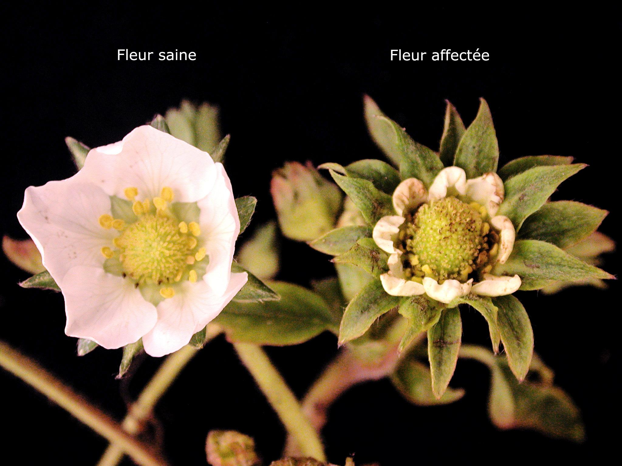 La fleur de droite est difforme avec des pétales très courts et une surabondance de sépales lorsque comparée à la fleur de fraisier saine (cv 'Cavendish'). Ces symptômes sont causés par une phytotoxicité occasionnée par l'utilisation de paille de céréales traitée au glyphosate en prérécolte.