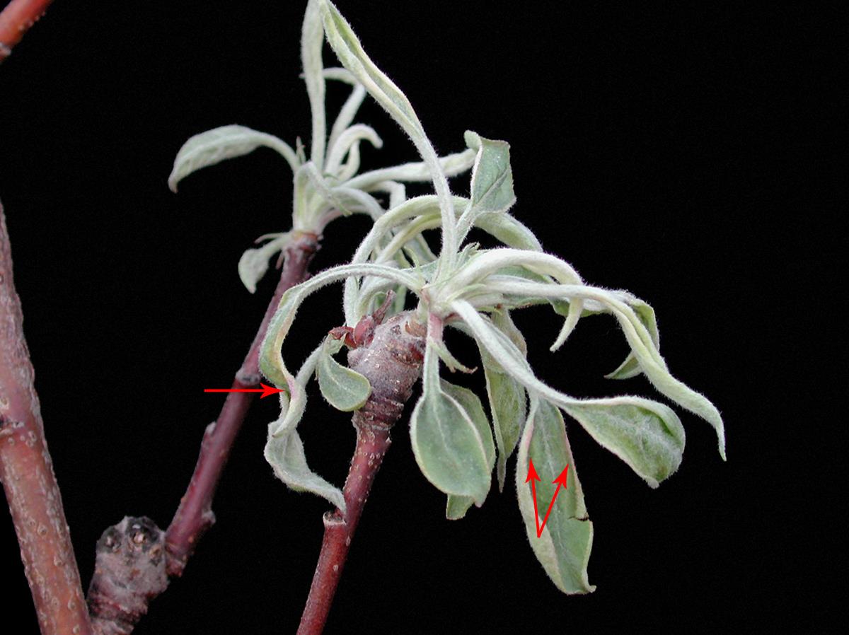 Des rameaux de pommier (cv 'Cortland') montrent des bouquets foliaires déformés. Les jeunes feuilles sont petites, filiformes et ont une marge légèrement teintée de rose qui s’enroule vers le haut (voir flèches). Les fleurs étaient petites, pâles et avec des pétales étroits (non visible ici). Selon les symptômes, il pourrait s’agir de dommages causés par une phytotoxicité au glyphosate. Les dommages observés au printemps ont pour origine les traitements réalisés à la fin de l’été ou à l’automne précédent.